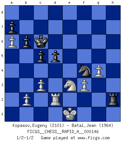 Last move : 1/2-1/2 2014 January 24 0:30:33 [Event "FICGS__CHESS__RAPID_A__000146"] [Site "FICGS"] [Date "2013.09.06"] [Round "1"] [White "Kopasov,Evgeny"] [Black "Batal,Jean"] [Result "1/2-1/2"] [WhiteElo "2101"] [BlackElo "1964"] 1.e4 c6 2.d4 d5 3.e5 Bf5 4.Nf3 e6 5.Be2 Nd7 6.O-O Ne7 7.Nbd2 h6 8.Nb3 g5 9.a4 Bg7 10.a5 Qc7 11.Be3 f6 12.exf6 Bxf6 13.Re1 O-O-O 14.a6 b6 15.h3 Rhg8 16.Nh2 Kb8 17.Bd2 e5 18.dxe5 Nxe5 19.Nd4 Bc8 20.c3 c5 21.Ndf3 g4 22.Nxe5 gxh3 23.Neg4 h5 24.g3 hxg4 25.Bxg4 Bg5 26.Bxc8 Nxc8 27.Bxg5 Rxg5 28.Qf3 Nd6 29.g4 Nc4 30.Re2 Ne5 31.Qxh3 Rg7 32.Rae1 Rh7 33.Qg3 Nd3 34.Qxc7+ Kxc7 35.Re7+ Rd7 36.Rxh7 Rxh7 37.Re2 Kd6 38.Nf1 Rh4 39.Ne3 Kc6 40.Rd2 Nf4 41.f3 Rh3 42.Kf2 Rh2+ 43.Ke1 Rh3 44.Kf2 Rh2+ 45.Ke1 1/2-1/2 Caro-Kann : Advance variation Kingside Castling by player White (move 6) Queenside Castling by player Black (move 13) This chess game ended in a draw. Follow this game move after move (download)When you see a good move, look for a better one. (Emanuel Lasker) Du musst Deinen Gegner in einen tiefen dunklen Wald führen wo 2+2=5 ist und wo der Weg, der wieder hinausführt, nur breit genug für einen ist. (Mikhail Nekhemyevich Tal) Sin errores no puede haber brillantez. (Emanuel Lasker) Les réformistes prétendent que les progrès de la théorie conduiront à la disparition des échecs, et qu'il faut, pour leur rendre vie, en remanier les règles. En réalité, qu'exprime cette affirmation? Le mépris de l'intuition, de l'imagination et de tous les autres éléments qui font des échecs un art. (Alexander Alekhine) A good book on your shelf is a friend that turns its back on you and remains a friend. (Author unknown)