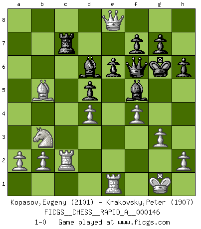 Last move : 1-0 2014 February 20 1:30:17 [Event "FICGS__CHESS__RAPID_A__000146"] [Site "FICGS"] [Date "2013.09.06"] [Round "1"] [White "Kopasov,Evgeny"] [Black "Krakovsky,Peter"] [Result "1-0"] [WhiteElo "2101"] [BlackElo "1907"] 1.e4 c6 2.d4 d5 3.e5 Bf5 4.Nf3 e6 5.Be2 c5 6.Be3 cxd4 7.Nxd4 Ne7 8.Nd2 Nbc6 9.N2f3 Be4 10.O-O Rc8 11.c3 h6 12.Nd2 Bg6 13.Nb5 Nf5 14.Bxa7 Nxe5 15.Qa4 Nc6 16.Qb3 Qf6 17.Bd4 Nfxd4 18.Nxd4 Nxd4 19.cxd4 Bd6 20.Qb5+ Ke7 21.Nb3 Rc7 22.Qb6 Rhc8 23.g3 Rc6 24.Qxb7+ R8c7 25.Qa8 Rc2 26.Rae1 Be4 27.f3 Bf5 28.Bb5 Qg5 29.Qe8+ Kf6 30.Qd8+ Be7 31.Qb8 Kg6 32.Rf2 Bd6 33.f4 Qe7 34.Qe8 Qf6 35.Rxc2 1-0 This chess game has been lost on time (started : 2013.09.06 17:1:28) Caro-Kann : Advance variation Kingside Castling by player White (move 10) Player White won this chess game. Follow this game move after move (download)The enormous mental resilience, without which no Chess player can exist, was so much taken up by Chess that he could never free his mind of this game. (Albert Einstein) Dieses schreckliche Gefühl, dass ich gegen eine Maschine spielte, die niemals Fehler macht, zerschmetterte meinen Widerstand. (Mark Taimanov) El jugador blanco perdió porque fallo en recordar la coreccta continuación y tuvo que pensar por sí mismo las movidas. (Siegbert Tarrasch) Votre seul travail dans les ouvertures est d'obtenir un milieu de partie jouable. (Lajos Portish) The beginning of wisdom is silence. The second step is listening. (Unknown)