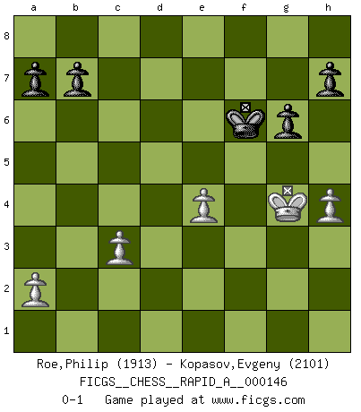 Last move : 0-1 2013 November 26 3:36:44 [Event "FICGS__CHESS__RAPID_A__000146"] [Site "FICGS"] [Date "2013.09.06"] [Round "1"] [White "Roe,Philip"] [Black "Kopasov,Evgeny"] [Result "0-1"] [WhiteElo "1913"] [BlackElo "2101"] 1.e4 c5 2.Nf3 d6 3.Bb5+ Bd7 4.Bxd7+ Qxd7 5.O-O Nc6 6.Qe2 g6 7.Rd1 Bg7 8.c3 e5 9.Na3 Nge7 10.d4 exd4 11.cxd4 Nxd4 12.Nxd4 cxd4 13.Bf4 O-O 14.Nb5 Be5 15.Bh6 Rfe8 16.Nxd4 Bxd4 17.Rxd4 Nf5 18.Qd2 Nxd4 19.Qxd4 f6 20.Bd2 Re6 21.Bc3 Qc6 22.f3 Qc5 23.Rd1 Qxd4+ 24.Rxd4 Rc8 25.Kf2 Kf7 26.g4 Rc6 27.Kg3 Re7 28.Rd2 Rd7 29.h4 d5 30.g5 R6c7 31.gxf6 dxe4 32.Rxd7+ Rxd7 33.fxe4 Rd3+ 34.Kf4 Rh3 35.Kg4 Rxc3 36.bxc3 Kxf6 0-1 Sicilian : Canal-Sokolsky attack, 3...Bd7 Kingside Castling by player White (move 5) Kingside Castling by player Black (move 13) 10 pieces endgame at move 36 : White KPPPP , Black KPPPP WHITE : King + 4 Pawns BLACK : King + 4 Pawns Player Black won this chess game. Follow this game move after move (download)Chess is a sea in which a gnat may drink and an elephant may bathe. (Hindu proverb) Alles was ich jemals tun will ist Schach spielen. (Robert James Fischer) Por la belleza de sus partidas, la claridad de su juego y lo brillante de sus ideas, Fischer se creó el mismo como un artista de la misma estatura como Brahms, Rembrandt y Shakespeare. (David Levy) Des idées, des idées, j'en ai cent, j'en ai mille. Des bonnes, des mauvaises, applicables, irréalisables... Il suffit de faire le tri ! (Roos) Now the reason the enlightened prince and the wise general conquer the enemy whenever they move and their achievements surpass those of ordinary men is foreknowledge. (Sun Tzu)