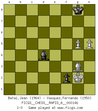 Last move : 1-0 2014 January 12 22:40:33 [Event "FICGS__CHESS__RAPID_A__000146"] [Site "FICGS"] [Date "2013.09.06"] [Round "1"] [White "Batal,Jean"] [Black "Vasquez,Fernando"] [Result "1-0"] [WhiteElo "1964"] [BlackElo "1950"] 1.c4 e5 2.Nc3 Nf6 3.g3 Nc6 4.Bg2 Bc5 5.d3 d6 6.Nf3 h6 7.O-O O-O 8.a3 Nd4 9.Ne1 a5 10.e3 Ne6 11.Nf3 c6 12.Rb1 Ba7 13.b4 Bd7 14.c5 Bb8 15.Na4 axb4 16.axb4 dxc5 17.bxc5 Ra7 18.Qc2 Ng5 19.Nxg5 hxg5 20.e4 g4 21.Be3 Be6 22.Rb4 Nh7 23.Rfb1 Qe7 24.Nb6 Ng5 25.Nc4 Nf3+ 26.Bxf3 gxf3 27.Nd2 f5 28.exf5 Rxf5 29.Ne4 Bd5 30.Ra4 Rxa4 31.Qxa4 Qd7 32.h4 Qc8 33.Qa8 Rf7 34.Ng5 Re7 35.Bd2 Qc7 36.Bc3 Qc8 37.Re1 Qe8 38.Qa1 Bc7 39.Re3 b6 40.cxb6 Bxb6 41.Rxe5 Rxe5 42.Bxe5 Bc5 43.Nh3 Be6 44.Nf4 Bf8 45.Nxe6 Qxe6 46.Kh2 c5 47.Qc3 Kf7 48.d4 Qd5 49.dxc5 Bxc5 50.Bxg7 Bxf2 51.Qf6+ Ke8 52.Qe5+ Qxe5 53.Bxe5 Kf7 54.h5 Be3 55.Bf4 Bd4 56.g4 Bf2 57.Be5 Kg8 58.Kh3 Kh7 59.Bf4 Kg7 60.g5 Bd4 61.Kg3 f2 62.Kg2 Kg8 63.Bg3 1-0 English : Carls' Bremen system Kingside Castling by player White (move 7) Kingside Castling by player Black (move 7) 10 pieces endgame at move 50 : White KQBPPP , Black KQBP WHITE : King + 1 Queen 1 Bishop 3 Pawns BLACK : King + 1 Queen 1 Bishop 1 Pawn 9 pieces endgame at move 50 : White KQBPP , Black KQBP WHITE : King + 1 Queen 1 Bishop 2 Pawns BLACK : King + 1 Queen 1 Bishop 1 Pawn 8 pieces endgame at move 52 : White KBPP , Black KQBP WHITE : King + 1 Bishop 2 Pawns BLACK : King + 1 Queen 1 Bishop 1 Pawn 7 pieces endgame at move 53 : White KBPP , Black KBP WHITE : King + 1 Bishop 2 Pawns BLACK : King + 1 Bishop 1 Pawn Player White won this chess game. Follow this game move after move (download)Kasparov : J'adoube , Ivanchuk : S'il vous plaît ! (Garry Kasparov & Vassily Ivanchuk, Linares 1997) Ich brauche nur einen Blick auf das Schachbrett zu werfen, und weiß schon, was in der Stellung steckt, was geschehen kann und was geschehen wird. Alle übrigen suchen und prüfen, ich aber weiß es! (José Raúl Capablanca) Estaba muy claro de que el punto vulnerable del Gran Maestro Americano (Bobby Fischer) radicaba en las posiciones de doble filo, colgantes, irracionales, donde el siempre falló en encontrar un triunfo aún en una posición de clara victoria. (Efim Geller) Le temps de noter son nom sur la feuille de partie, j'étais déjà en zeitnot ! D'un modeste amateur apparié lors de la première ronde d'un open contre le grand-maître Azmaïparashvili. I have opinions of my own - strong opinions - but I don't always agree with them. (George Bush)