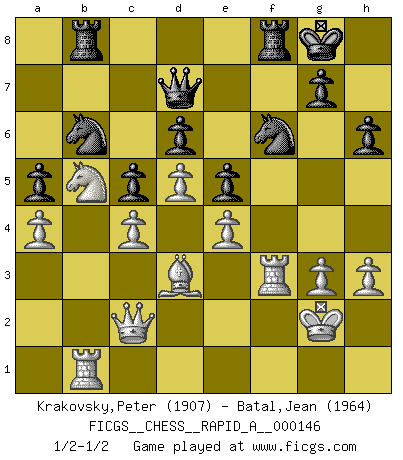 Last move : 1/2-1/2 2013 November 29 21:7:41 [Event "FICGS__CHESS__RAPID_A__000146"] [Site "FICGS"] [Date "2013.09.06"] [Round "1"] [White "Krakovsky,Peter"] [Black "Batal,Jean"] [Result "1/2-1/2"] [WhiteElo "1907"] [BlackElo "1964"] 1.c4 Nf6 2.d4 c5 3.d5 e5 4.Nc3 d6 5.e4 Be7 6.Nf3 Nbd7 7.Be2 Nf8 8.O-O Ng6 9.Ne1 O-O 10.Nd3 a6 11.a4 b6 12.Be3 Ne8 13.Qd2 f5 14.exf5 Bxf5 15.f3 Nf6 16.b3 h6 17.g3 Nh7 18.b4 a5 19.bxc5 bxc5 20.Nf2 Bg5 21.Nb5 Ne7 22.Rae1 Bxe3 23.Qxe3 Bc2 24.Qa3 Qd7 25.Qa2 Bg6 26.Ne4 Bxe4 27.fxe4 Nf6 28.Qc2 Nc8 29.Rf2 Nb6 30.Ref1 Qe7 31.Rf5 Rab8 32.Kg2 Kh8 33.h3 Kh7 34.R5f3 Kg8 35.Rb1 Qd7 36.Bd3 1/2-1/2 English, 1...Nf6 (Anglo-Indian defense) Kingside Castling by player White (move 8) Kingside Castling by player Black (move 9) This chess game ended in a draw. Follow this game move after move (download)Nonsense was the last thing Fischer was interested in, as far as Chess was concerned. (Elie Agur) Gegen einen Schachcomputer zu verlieren ist wie Löcher in den Strümpfen zuhaben. Es ist nicht peinlich, solange man der einzige ist der es weiß. (Anonymous) Es muy difícil jugar en contra de la teoría de Einstein. - en su primera derrota en contra de Fischer (Mikhail Tal) Vouloir jouer aux échecs contre soi-même est aussi paradoxal que vouloir marcher sur son ombre. (Stefan Zweig) The obstacle is the path. (Zen proverb)