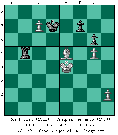 Last move : 1/2-1/2 2014 January 14 0:39:22 [Event "FICGS__CHESS__RAPID_A__000146"] [Site "FICGS"] [Date "2013.09.06"] [Round "1"] [White "Roe,Philip"] [Black "Vasquez,Fernando"] [Result "1/2-1/2"] [WhiteElo "1913"] [BlackElo "1950"] 1.e4 e5 2.Nf3 Nf6 3.Nxe5 d6 4.Nf3 Nxe4 5.d4 d5 6.Bd3 Nc6 7.O-O Be7 8.c4 Nb4 9.Be2 O-O 10.Nc3 Be6 11.Nxe4 dxe4 12.Ne1 Bf5 13.Be3 Bf6 14.Qd2 a5 15.g4 Bg6 16.a3 Nc6 17.d5 Ne5 18.g5 Be7 19.f4 exf3 20.Nxf3 Nxf3+ 21.Bxf3 Re8 22.Rae1 Bf8 23.Bf4 Qd7 24.Rxe8 Rxe8 25.Qxa5 Bd3 26.Qxc7 Qh3 27.Bg2 Qf5 28.Rf3 Re1+ 29.Kf2 Re7 30.Qb8 Re2+ 31.Kg3 h5 32.Qxf8+ Kxf8 33.Bd6+ Ke8 34.Rxf5 Bxf5 35.b4 h4+ 36.Kf3 Bg4+ 37.Kxg4 Rxg2+ 38.Kxh4 g6 39.Bf4 Ra2 40.c5 Rxa3 41.c6 bxc6 42.dxc6 Rb3 43.Bd6 Re3 44.Kg4 Re6 45.c7 Kd7 46.Bf4 Rb6 47.Kf3 Rxb4 48.Be5 Rc4 49.Ke3 Rc2 50.Ke4 Rc5 51.Kd4 Rb5 52.Ke4 1/2-1/2 Petrov : Classical attack Kingside Castling by player White (move 7) Kingside Castling by player Black (move 9) 10 pieces endgame at move 42 : White KBPPPP , Black KRPP WHITE : King + 1 Bishop 4 Pawns BLACK : King + 1 Rook 2 Pawns 9 pieces endgame at move 47 : White KBPPP , Black KRPP WHITE : King + 1 Bishop 3 Pawns BLACK : King + 1 Rook 2 Pawns This chess game ended in a draw. Follow this game move after move (download)You sit at the board and suddenly your heart leaps. Your hand trembles to pick up the piece and move it. But what Chess teaches you is that you must sit there calmly and think about whether it's really a good idea and whether there are other better ideas. (Stanley Kubrick) Taktik ist was man tun muß, wenn etwas zu tun ist. Strategie ist was man tun muß, wenn nichts zu tun ist. (Savielly Grigorievitsch Tartakower) ¿Cual es el objetivo de jugar una apertura de gambito?... Para adquirir una reputación de ser un jugador apuesto a costo de perder el juego. (Siegbert Tarrasch) Les Echecs, c'est l'art de la guerre sans les charniers, c'est la résurrection des morts tombés au champ d'honneur, l'espoir perpétuel, la suprématie de l'intelligence sur la force, la culture de l'esprit. (F. Szpiner) You can't play chess if you're groggy from pills. (Anatoly Karpov)