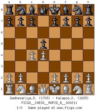 Last move : 1-0 2013 October 27 4:50:18 [Event "FICGS__CHESS__RAPID_B__000211"] [Site "FICGS"] [Date "2013.09.08"] [Round "1"] [White "Gadhesariya,Divyesh"] [Black "Kalapos,Karol"] [Result "1-0"] [WhiteElo "1703"] [BlackElo "1639"] 1.d4 d5 2.c4 1-0 This chess game has been lost on time (started : 2013.09.08 5:42:3) Queen's Gambit Player White won this chess game. Follow this game move after move (download)The Pawns are the soul of the game. (Francois Andre Danican Philidor) Am wohlsten fühle ich mich, wenn ich sehe, wie sich mein Gegner im Todeskampf windet. (Robert James Fischer) El muchacho (en ese entonces un niño de 12 años llamado Anatoly Karpov) no tiene ni idea de lo que es el Ajedrez y no hay futuro en absoluto para el en esta profesión. (Mikhail Botvinnik) Il n'y a plus de joueurs du niveau de Jacob Murray dont la seule quête est le beau jeu, le plaisir de voir les pièces construire quelque chose. Sur 10 idées à la minute, 9 seront sans intérêt, la dernière s'avèrera géniale. (Christian Bauer) Any activity becomes creative when the doer cares about doing it right or doing it better. (John Updike)