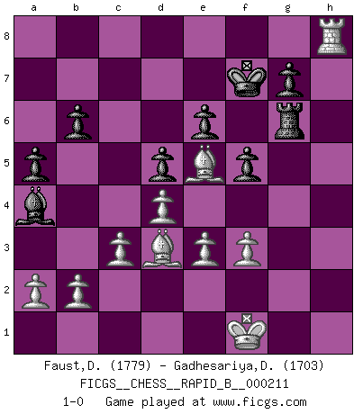 Last move : 1-0 2013 November 30 13:56:33 [Event "FICGS__CHESS__RAPID_B__000211"] [Site "FICGS"] [Date "2013.09.08"] [Round "1"] [White "Faust,Dieter"] [Black "Gadhesariya,Divyesh"] [Result "1-0"] [WhiteElo "1779"] [BlackElo "1703"] 1.d4 Nf6 2.Nf3 e6 3.Bg5 Be7 4.Nbd2 O-O 5.e3 b6 6.Bd3 Bb7 7.c3 d5 8.h3 Nbd7 9.O-O Ne4 10.Bf4 f5 11.Re1 Bh4 12.Nxh4 Qxh4 13.Qe2 Ndf6 14.Bxc7 Nxd2 15.Qxd2 Ne4 16.Qe2 Rf6 17.f3 Ng5 18.Qf2 Nxh3 19.gxh3 Qxh3 20.Qf1 Rg6 21.Kf2 Qh4 22.Ke2 Rc8 23.Be5 a5 24.Qf2 Qh3 25.Rg1 Kf7 26.Rh1 Qg2 27.Rxh7 Bc6 28.Rah1 Ba4 29.Qxg2 Rxg2 30.Kf1 Rg6 31.Rh8 Rxh8 32.Rxh8 1-0 Queen's pawn : Torre attack Kingside Castling by player Black (move 4) Kingside Castling by player White (move 9) Player White won this chess game. Follow this game move after move (download)I am still a victim of Chess. It has all the beauty of art and much more. It cannot be commercialized. Chess is much purer than art in its social position. (Marcel Duchamp) Rauchen ist dem Schachspieler bei seiner Arbeit, also im Wettkampf, untersagt. (Viktor Kortschnoi) El Ajedrez es imaginación. (David Bronstein) Un millionnaire : 'Monsieur Steinitz ! Vous ne participez aux tournois que pour l'argent, alors que moi je n'y viens que pour l'honneur.' Steinitz : 'Chacun joue pour ce qu'il n'a pas'... Remember : Your focus determines your reality. (Qui-Gon Jinn in Star Wars ep.1)