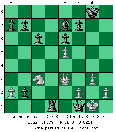 Last move : 0-1 2013 October 14 11:47:26 [Event "FICGS__CHESS__RAPID_B__000211"] [Site "FICGS"] [Date "2013.09.08"] [Round "1"] [White "Gadhesariya,Divyesh"] [Black "Sternik,Ryszard"] [Result "0-1"] [WhiteElo "1703"] [BlackElo "1800"] 1.d4 d5 2.c4 c6 3.Nf3 Bf5 4.Nc3 e6 5.g3 Nf6 6.Bg2 Nbd7 7.O-O dxc4 8.Bg5 Qb6 9.Qc1 h6 10.Bf4 Be7 11.Rd1 Nd5 12.Bd2 O-O 13.Rb1 Bxb1 14.Nxb1 Qa6 15.Bxh6 gxh6 16.Qxh6 Rfd8 17.Ne5 Nxe5 18.dxe5 Nf4 19.Rxd8 Rxd8 20.Nc3 Nxe2+ 21.Nxe2 Rd1+ 22.Bf1 c3 23.Qe3 cxb2 24.Nc3 Qxf1+ 0-1 QGD Slav : 3.Nf3 Kingside Castling by player White (move 7) Kingside Castling by player Black (move 12) Player Black won this chess game. Follow this game move after move (download)A win by an unsound combination, however showy, fills me with artistic horror. (Wilhelm Steinitz) Ich kenne keine einzige Person, die behaupten würde, Garri Kasparow sei ein guter Mensch (Nigel Short) El Ajedrez es el arte del análisis. (Mikhail Botvinnik) Le joueur d'Echecs qui veut atteindre le top est obligé de développer son propre credo créatif. Alexeï Stepanovicth Souétine. Il est facile d'écrire des livres ! Ce qui est difficile, c'est de jouer ! (Alexeï Stepanovicth Souétine) Whoever said the pen is mightier than the sword obviously never encountered automatic weapons. (US General Douglas MacArthur)