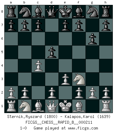 Last move : 1-0 2013 October 18 16:29:26 [Event "FICGS__CHESS__RAPID_B__000211"] [Site "FICGS"] [Date "2013.09.08"] [Round "1"] [White "Sternik,Ryszard"] [Black "Kalapos,Karol"] [Result "1-0"] [WhiteElo "1800"] [BlackElo "1639"] 1.Nf3 d5 2.e3 g6 3.c4 1-0 This chess game has been lost on time (started : 2013.09.08 5:42:3) Reti Opening Player White won this chess game. Follow this game move after move (download)Fischer wanted to give the Russians a taste of their own medicine. (Larry Evans) Wenn du gegen Bobby spielst, ist es keine Frage von gewinnen oder verlieren. Es ist eine Frage des Überlebens. (Boris Vassilievich Spassky) Estaba muy claro de que el punto vulnerable del Gran Maestro Americano (Bobby Fischer) radicaba en las posiciones de doble filo, colgantes, irracionales, donde el siempre falló en encontrar un triunfo aún en una posición de clara victoria. (Efim Geller) Pour se monter efficace, un Cavalier a besoin d'avant-postes ! Les Cavaliers font les meilleurs bloqueurs de pions passés. Employ the attack like tactic of defense. (Chinese proverb)