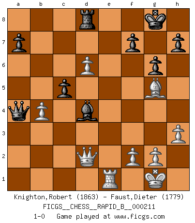 Last move : 1-0 2013 October 21 13:16:50 [Event "FICGS__CHESS__RAPID_B__000211"] [Site "FICGS"] [Date "2013.09.08"] [Round "1"] [White "Knighton,Robert"] [Black "Faust,Dieter"] [Result "1-0"] [WhiteElo "1863"] [BlackElo "1779"] 1.d4 Nf6 2.c4 e6 3.Nc3 c5 4.d5 exd5 5.cxd5 d6 6.e4 g6 7.Nf3 Bg7 8.h3 O-O 9.Bd3 b5 10.Bxb5 Nxe4 11.Nxe4 Qa5+ 12.Nfd2 Qxb5 13.Nxd6 Qa6 14.N2c4 Nd7 15.O-O Ne5 16.Nxc8 Raxc8 17.Nxe5 Bxe5 18.Re1 Rfe8 19.Bg5 Bd4 20.Rb1 Qxa2 21.d6 Rxe1+ 22.Qxe1 Qa4 23.b4 Re8 24.Qd2 Qd7 25.Bf4 Rd8 26.Re1 Qa4 27.Bg5 1-0 Queen's pawn game Kingside Castling by player Black (move 8) Kingside Castling by player White (move 15) Player White won this chess game. Follow this game move after move (download)You have to have the fighting spirit. You have to force moves and take chances. (Bobby Fischer) Rubinstein ist ein Turmendspiel, welches die Götter vor tausenden von Jahren begannen. (Savielly Grigorievitsch Tartakower) El Ajedrez es el juego mas altamente simbólico, pero las agresiones estan por lo tanto aún mas francamente representadas en la partida. Tal vez comenzo como un juego de guerra; Algo como la representación de una batalla en miniatura entre las fuerzas de dos reinos. (Karl Meninger) Dans le domaine de la peinture, de la gravure et de la sculpture, dès la première décennie de notre siècle, les artistes abandonnent la représentation de la partie d'échecs pour se concentrer sur les pièces, sur les échiquiers et sur toutes les variations auxquelles les unes et les autres peuvent donner lieu. On passe en quelque sorte d'un thème social à un thème musical (au sens de la musica médiévale, c'est-à-dire d'une notion qui inclue le rythme, l'harmonie, la construction et la déconstruction, etc.). Graphiquement et picturalement, l'échiquier apparaît comme une structure ouverte, dynamique, d'une richesse infinie, autorisant toutes les combinatoires et débouchant sur des mouvements et des rythmes de nature exponentielle. (Michel Pastoureau) Humor is by far the most significant activity of the human brain. (Edward De Bono)