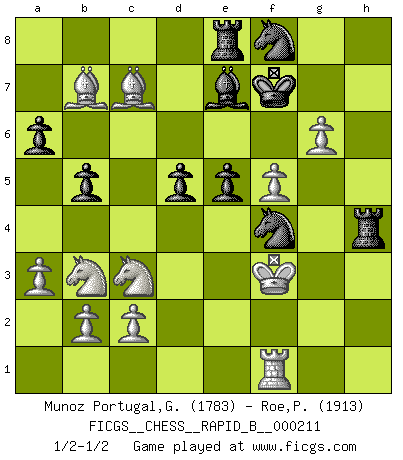 Last move : 1/2-1/2 2013 October 20 5:3:2 [Event "FICGS__CHESS__RAPID_B__000211"] [Site "FICGS"] [Date "2013.09.08"] [Round "1"] [White "Munoz Portugal,Guillermo"] [Black "Roe,Philip"] [Result "1/2-1/2"] [WhiteElo "1783"] [BlackElo "1913"] 1.e4 c5 2.Nf3 e6 3.Nc3 a6 4.d4 cxd4 5.Nxd4 b5 6.Bd3 Bb7 7.O-O Bc5 8.Nb3 Be7 9.e5 Qc7 10.Bf4 Nc6 11.Re1 g5 12.Bg3 h5 13.h3 g4 14.hxg4 h4 15.Bf4 h3 16.gxh3 Rxh3 17.Be4 f6 18.Bg2 Rh8 19.Qf3 fxe5 20.Rxe5 Nxe5 21.Qxb7 Qxb7 22.Bxb7 Ng6 23.Bg3 Rd8 24.Bc7 Nf6 25.g5 Nh7 26.f4 Kf7 27.Rd1 Nhf8 28.Rf1 Re8 29.a3 Rh4 30.Kg2 e5 31.f5 Nf4+ 32.Kf3 d5 33.g6 1/2-1/2 Comment by player 2 : Philip Roe : 33.g6+ Kf6 34.Nxd5+ Nxd5 35.Bxd5 Rf4+ 36.Ke2 Rxf5 37.Rxf5+ Kxf5 38.Bf7 Rc8 39.g7 Ne6 40.Bxe5 Kxe5 41.g8=Q Rxg8 42.Bxg8 Nd4+ is a forced line for both players. Sicilian defense Kingside Castling by player White (move 7) This chess game ended in a draw. Follow this game move after move (download)Chess, like love, is infectious at any age. (Flohr) Vielleicht wirkt die Aura früherer Spieler glanzvoller als die der heutigen Spieler, aber das liegt daran, dass man kein Programm wie Fritz hatte, das einem all die Löcher in ihren Partien zeigt. (Vladimir Kramnik) Uno por uno, yo los acribillé, mi superioridad muy pronto se volvio aparente. (Jose Capablanca) Vouloir jouer aux échecs contre soi-même est aussi paradoxal que vouloir marcher sur son ombre. (Stefan Zweig) Empty your mind, be formless, shapeless — like water. (Bruce Lee)