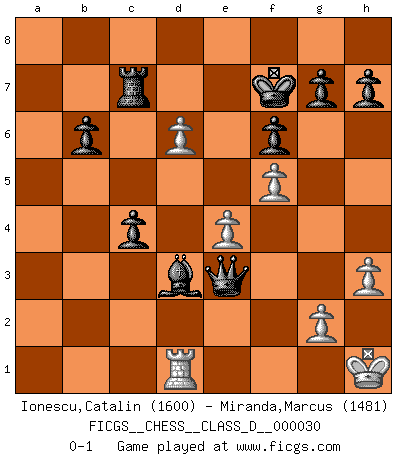 Last move : 0-1 2007 June 7 12:1:5 [Event "FICGS__CHESS__CLASS_D__000030"] [Site "FICGS"] [Date "2007.02.06"] [Round "1"] [White "Ionescu,Catalin"] [Black "Miranda,Marcus"] [Result "0-1"] [WhiteElo "1600"] [BlackElo "1481"] 1.e4 e5 2.Bc4 Nf6 3.d3 Nc6 4.Nf3 Be7 5.O-O O-O 6.Be3 d6 7.h3 Na5 8.Bb3 Nxb3 9.axb3 c6 10.c4 b6 11.b4 Re8 12.Qd2 Nd7 13.b3 d5 14.Nc3 d4 15.Nxd4 exd4 16.Bxd4 Nf6 17.Be3 Bxb4 18.Rfd1 c5 19.Qc2 Qe7 20.Bd2 a5 21.Re1 Qe5 22.Nd5 Bxd2 23.Qxd2 Qd6 24.f4 Nxd5 25.cxd5 Bd7 26.Qf2 f6 27.f5 a4 28.bxa4 Bxa4 29.Ra2 Bb5 30.Rd1 Qe5 31.Qb2 Rxa2 32.Qxa2 Qd4+ 33.Kh1 Bxd3 34.Qb3 c4 35.Qb5 Kf8 36.Qb4+ Kf7 37.Qd6 Qe3 38.Qc7+ Re7 39.d6 Rxc7 0-1 Bishop's Opening : Berlin defense Kingside Castling by player White (move 5) Kingside Castling by player Black (move 5) Player Black won this chess game. Follow this game move after move (download)You may learn much more from a game you lose than from a game you win. You will have to lose hundreds of games before becoming a good player. (Jose Raul Capablanca) Ich las kürzlich ein Buch von Nietzsche. Er sagte Religion verdumme nur die Menschen. Ich stimme zu. (Robert James Fischer) Algunos sacrificios son sólidos, los demás son míos. (Mikhail Tal) Toutes choses étant égales, c'est la conviction qui gagne. Alliée à une volonté de vaincre, elle sert de détonateur, suscite des idées, disperse les doutes et aide à penser clairement. (Robert Fischer) You lose, general Kenobi. (General Grievous in Star Wars ep.3)