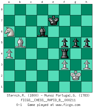 Last move : 0-1 2013 December 12 22:15:15 [Event "FICGS__CHESS__RAPID_B__000211"] [Site "FICGS"] [Date "2013.09.08"] [Round "1"] [White "Sternik,Ryszard"] [Black "Munoz Portugal,Guillermo"] [Result "0-1"] [WhiteElo "1800"] [BlackElo "1783"] 1.Nf3 Nf6 2.e3 d5 3.c4 c6 4.Nc3 g6 5.d4 Bg7 6.cxd5 cxd5 7.Qb3 O-O 8.Bd3 Nc6 9.O-O a6 10.Bd2 Bg4 11.Rac1 Qd6 12.h3 Bxf3 13.gxf3 e5 14.dxe5 Nxe5 15.Be2 b5 16.Rfd1 Qe6 17.f4 Nc4 18.Bf1 d4 19.exd4 Rfe8 20.a4 Nxd2 21.Qxe6 Nf3 22.Kg2 Nh4 23.Kg3 Rxe6 24.Kxh4 b4 25.Bg2 Rd8 26.d5 R6e8 27.Na2 Nh5 28.Nxb4 f5 29.Rc6 Bf8 30.d6 Rxd6 31.R1xd6 Be7 32.Rf6 Nxf6 33.Rxf6 Bxf6 34.Kg3 Bxb2 35.Nxa6 Rc8 36.Bf1 Ba3 37.Bb5 Bd6 38.Kg2 Kf7 39.Be2 Rc2 40.Bb5 Rd2 41.Bc4+ Ke7 42.Kf3 Rd4 43.Bb5 Rxf4 44.Kg2 g5 45.f3 h5 0-1 Reti Opening Kingside Castling by player Black (move 7) Kingside Castling by player White (move 9) Player Black won this chess game. Follow this game move after move (download)Spassky will not be psyched out by Fischer. (Mike Goodall) Heutzutage gewinnt im Turnier nicht derjenige Spieler, der weitreichende Pläne entwirft, sondern einfach jener, der Zug um Zug kämpft. (David Bronstein) Fischer es el jugador mas fuerte del mundo. De hecho, el jugador mas fuerte que jamas haya existido. (Larry Evans) J'ai toujours senti une vague pitié pour l'homme qui ne connaît rien aux échecs, tout comme j'en aurais pour un homme ignorant de l'amour. Les Echecs, comme la musique ou comme l'amour, ont le pouvoir de rendre heureux. (Siegbert Tarrasch) Work expands to fill the time available. (C. Northcote Parkinson, in Parkinson's Laws)