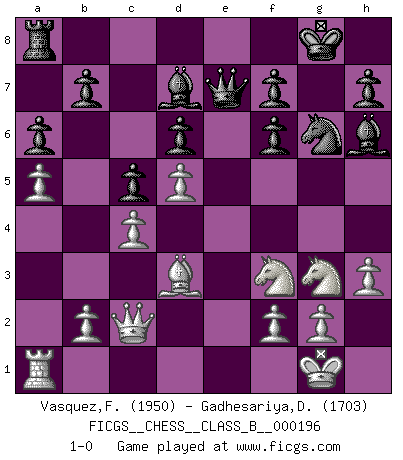 Last move : 1-0 2014 March 22 8:25:26 [Event "FICGS__CHESS__CLASS_B__000196"] [Site "FICGS"] [Date "2013.09.08"] [Round "1"] [White "Vasquez,Fernando"] [Black "Gadhesariya,Divyesh"] [Result "1-0"] [WhiteElo "1950"] [BlackElo "1703"] 1.e4 c5 2.c3 Nc6 3.d4 e6 4.d5 exd5 5.exd5 Nb8 6.Nf3 d6 7.Bd3 Nf6 8.O-O Nbd7 9.Re1+ Be7 10.Qb3 O-O 11.h3 a6 12.c4 Re8 13.Nc3 Nf8 14.a4 Ng6 15.Qc2 Bf8 16.Bg5 Bd7 17.Rxe8 Qxe8 18.Bxf6 gxf6 19.a5 Bh6 20.Ne4 Qe7 21.Ng3 1-0 Sicilian : Alapin's variation (2.c3) Kingside Castling by player White (move 8) Kingside Castling by player Black (move 10) Player White won this chess game. Follow this game move after move (download)Chess is 99 percent tactics. (Teichmann) Es war undenkbar für die Behörden, dass ein sowjetischer Großmeister auf diese Art und Weise [Fischer-Taimanov 6:0] verliert, ohne dass es eine politischer Erklärung dafür gäbe. (Mark Taimanov) El Ajedrez es un juego terrible. Si no dominas el centro, tu oponente tiene una posición mas libre. Si tu tienes el centro, entonces realmente tienes algo de que preocuparte. (Siegbert Tarrasch) Je menace de comprendre la position. (Anonyme) Only sick music makes money today. (Friedrich Nietzsche)