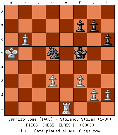 Last move : 1-0 2007 March 4 16:51:18 [Event "FICGS__CHESS__CLASS_D__000030"] [Site "FICGS"] [Date "2007.02.06"] [Round "1"] [White "Carrizo,Jose"] [Black "Stoianov,Stoian"] [Result "1-0"] [WhiteElo "1400"] [BlackElo "1400"] 1.e4 e5 2.Nf3 d6 3.d4 exd4 4.Nxd4 Nf6 5.Nc3 Be7 6.Bf4 O-O 7.Qd2 c5 8.Ndb5 Bd7 9.O-O-O Bxb5 10.Bxb5 a6 11.Bc4 b5 12.Bd5 Nxd5 13.Nxd5 Nc6 14.Nxe7+ Qxe7 15.Bxd6 Qxe4 16.Bxf8 Rxf8 17.Qd5 Qf4+ 18.Kb1 Nd4 19.Qxc5 Ne6 20.Qb6 Qe4 21.f3 Qe2 22.Rhg1 h6 23.Qxa6 Nc5 24.Qb6 Rc8 25.Rd8+ Rxd8 26.Qxd8+ Kh7 27.b4 Na4 28.Qd3+ Qxd3 29.cxd3 Nc3+ 30.Kc2 Nd5 31.Kb3 Kg6 32.a4 bxa4+ 33.Kxa4 Kf6 34.Re1 Nc3+ 35.Ka5 Nd5 36.b5 Kf5 37.b6 1-0 Philidor : Exchange variation Kingside Castling by player Black (move 6) Queenside Castling by player White (move 9) Player White won this chess game. Follow this game move after move (download)He who takes the Queen's Knight's Pawn will sleep in the streets. (Anonymous) Besser ein falscher Plan, logisch durchgeführt, als gar kein Plan. (Viktor Kortschnoi) El Jaque al descubierto es el bombardero del tablero. (Reuben Fine) Il (Jacob Murray) ne joue pas pour le bon coup, mais pour le meilleur. (Eloi Relange) Life doesn't imitate art, it imitates bad television. (Woody Allen)