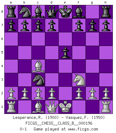 Last move : 0-1 2013 October 20 4:43:15 [Event "FICGS__CHESS__CLASS_B__000196"] [Site "FICGS"] [Date "2013.09.08"] [Round "1"] [White "Lesperance,Rand"] [Black "Vasquez,Fernando"] [Result "0-1"] [WhiteElo "1900"] [BlackElo "1950"] 1.e4 e5 2.Bc4 Nf6 3.Nf3 Nxe4 4.Nc3 Nxc3 0-1 This chess game has been lost on time (started : 2013.09.08 8:55:36) Bishop's Opening : Berlin defense Player Black won this chess game. Follow this game move after move (download)Dazzling combinations are for the many, shifting wood is for the few. (Georg Kieninger) Viele Opfer benötigen überhaupt keine konkrete Berechnung. Es genügt sich die entstehende Position kurz vorzustellen, um uns davon zu überzeugen, dass das Opfer korrekt ist. (Mikhail Nekhemyevich Tal) De eso se trata el Ajedrez. Un día le das una lección a tu oponente y al día siguiente el te da una a tí. (Bobby Fischer) Les écrivains ont utilisé les échecs pour analyser les côtés extrêmes de la nature humaine. Dans ce cadre, les échecs offrent un champ d'expérimentation idéal. Mais on pourrait faire la même chose avec la peinture. Et là, en vous référant à Van Gogh, vous ne tirerez pas de conclusion définitive sur les peintres. (Gary Kasparov) Life is verb, not a noun. (Charlotte Perkins Gilman)