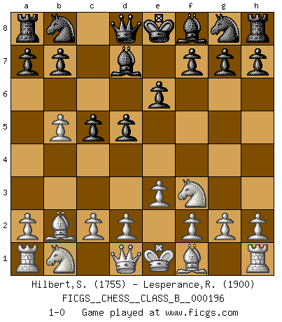 Last move : 1-0 2013 November 11 18:32:55 [Event "FICGS__CHESS__CLASS_B__000196"] [Site "FICGS"] [Date "2013.09.08"] [Round "1"] [White "Hilbert,Stephan J."] [Black "Lesperance,Rand"] [Result "1-0"] [WhiteElo "1755"] [BlackElo "1900"] 1.b4 d5 2.Bb2 e6 3.e3 c5 4.b5 Bd7 5.Nf3 1-0 This chess game has been lost on time (started : 2013.09.08 8:55:36) Polish (Sokolsky) opening Player White won this chess game. Follow this game move after move (download)Openings teach you openings. Endgames teach you chess ! (Stephan Gerzadowicz) Moralische Siege zählen nicht. (Savielly Grigorievitsch Tartakower) Desconfianza es la característica mas necesaria de un jugador de Ajedrez. (Siegbert Tarrasch) Nous vivons dans un monde échiquéen : chaque jour qui passe est un défi à relever. (Philosophe Sasha) The only thing that matters is the evidence. (Horatio Caine, C.S.I. Miami)
