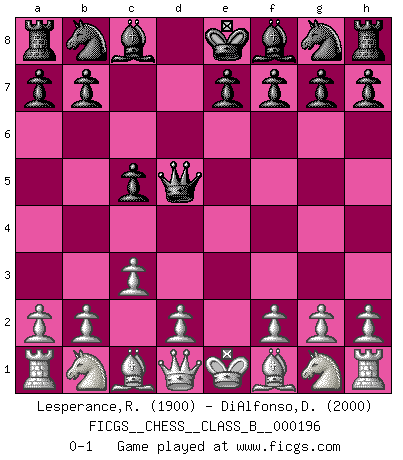 Last move : 0-1 2013 October 18 23:37:21 [Event "FICGS__CHESS__CLASS_B__000196"] [Site "FICGS"] [Date "2013.09.08"] [Round "1"] [White "Lesperance,Rand"] [Black "DiAlfonso,Darren"] [Result "0-1"] [WhiteElo "1900"] [BlackElo "2000"] 1.e4 c5 2.c3 d5 3.exd5 Qxd5 0-1 This chess game has been lost on time (started : 2013.09.08 8:55:36) Sicilian : Alapin's variation (2.c3) Player Black won this chess game. Follow this game move after move (download)If your opponent cannot do anything active, then don't rush the position; instead you should let him sit there, suffer, and beg you for a draw. (Jeremy Silman) Meine Liebe ist Schach, Schach, Schach. Ich muss jeden Tag Schach spielen, deshalb fühle ich mich so stark. (Miguel Najdorf) Sin errores no puede haber brillantez. (Emanuel Lasker) Pour se monter efficace, un Cavalier a besoin d'avant-postes ! Les Cavaliers font les meilleurs bloqueurs de pions passés. Once you start thinking you have nothing left to learn, you have everything to learn. (Steve Badget)