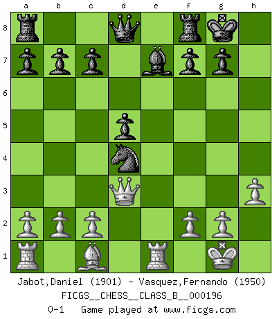 Last move : 0-1 2014 February 18 13:20:12 [Event "FICGS__CHESS__CLASS_B__000196"] [Site "FICGS"] [Date "2013.09.08"] [Round "1"] [White "Jabot,Daniel"] [Black "Vasquez,Fernando"] [Result "0-1"] [WhiteElo "1901"] [BlackElo "1950"] 1.e4 e5 2.Nf3 Nf6 3.Nxe5 d6 4.Nf3 Nxe4 5.d4 d5 6.Bd3 Nc6 7.O-O Be7 8.Re1 O-O 9.h3 Bf5 10.Nbd2 Nxd2 11.Bxf5 Nxf3+ 12.Qxf3 Nxd4 13.Bxh7+ Kxh7 14.Qd3+ Kg8 0-1 This chess game has been lost on time (started : 2013.09.08 8:55:36) Petrov : Classical attack Kingside Castling by player White (move 7) Kingside Castling by player Black (move 8) Player Black won this chess game. Follow this game move after move (download)Chess is in its essence a game, in its form an art, and in its execution a science. (Baron Tassilo) Gewinnen beim Schach fördert das Selbstvertrauen. Beim Sex spüre ich sowas nicht... (Garry Kasparov) El Ajedrez se juega con la mente... ¡no con las manos!. (Renaud y Kahn) Je fais ceci parce que dans cinquante coups j'obtiendrai cela; je m'appelle Mikhail Moisevitch Botvinnik. (Botvinnik) The only difference between a tax man and a taxidermist is that the taxidermist leaves the skin. (Mark Twain)