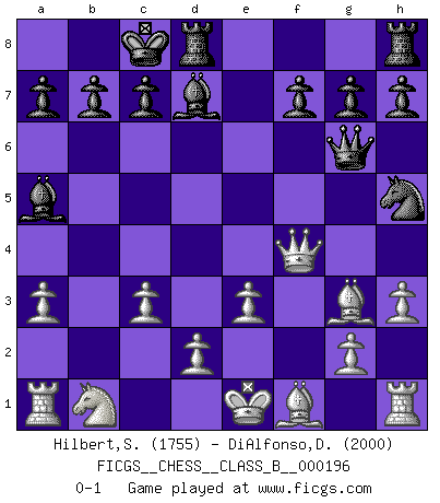 Last move : 0-1 2013 November 4 17:28:16 [Event "FICGS__CHESS__CLASS_B__000196"] [Site "FICGS"] [Date "2013.09.08"] [Round "1"] [White "Hilbert,Stephan J."] [Black "DiAlfonso,Darren"] [Result "0-1"] [WhiteElo "1755"] [BlackElo "2000"] 1.b4 e5 2.Bb2 Bxb4 3.f4 d6 4.Nf3 Nc6 5.a3 Ba5 6.fxe5 Nxe5 7.Nxe5 dxe5 8.Bxe5 Qg5 9.Bg3 Bg4 10.c3 O-O-O 11.Qa4 Nf6 12.h3 Bd7 13.Qf4 Qg6 14.e3 Nh5 0-1 Polish (Sokolsky) opening Queenside Castling by player Black (move 10) Player Black won this chess game. Follow this game move after move (download)Chess is like life. (Boris Spassky) Das Zentrum ist der Balkan des Schachbretts - Kriegshandlungen können in jedem Moment ausbrechen. (Aaron Nimzowitsch) Si el Ajedrez es una ciencia, es la mas inexacta. Si el Ajedrez es un arte, es demasiado inexacto para ser visto como tal. Si el Ajedrez es un deporte, es demasiado esotérico. Si el Ajedrez es un juego, es demasiado exigente para ser solo un juego. Si el Ajedrez es una aventura, es una muy demandante. Si el Ajedrez es una pasión, es una muy gratificante. Si el Ajedrez es la vida, es una muy triste. (Anónimo) On entre au jeu d'Echecs comme on entre en Religion. Pour le joueur d'Echecs, la partie d'Echecs c'est l'office, la messe, le défilé du 1er Mai, le dépôt de gerbe au Monument aux Morts. C'est un drame sacré. (Michel Roos) Memory... is the diary that we all carry with us. (Oscar Wilde, The Importance of Being Earnest)