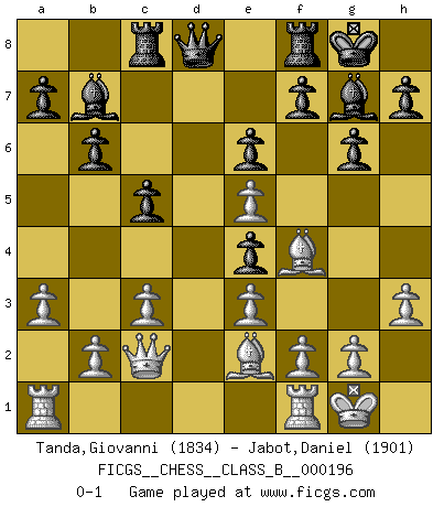 Last move : 0-1 2014 January 2 22:17:12 [Event "FICGS__CHESS__CLASS_B__000196"] [Site "FICGS"] [Date "2013.09.08"] [Round "1"] [White "Tanda,Giovanni"] [Black "Jabot,Daniel"] [Result "0-1"] [WhiteElo "1834"] [BlackElo "1901"] 1.d4 Nf6 2.Bf4 d5 3.e3 g6 4.Nf3 Bg7 5.Be2 O-O 6.O-O b6 7.Nbd2 c5 8.c3 Bb7 9.h3 Nc6 10.a3 Ne4 11.Qc2 Rc8 12.Nxe4 dxe4 13.Ne5 Nxe5 14.dxe5 e6 0-1 This chess game has been lost on time (started : 2013.09.08 8:55:36) Queen's pawn game Kingside Castling by player Black (move 5) Kingside Castling by player White (move 6) Player Black won this chess game. Follow this game move after move (download)Is Bobby Fischer quite sane ? (Salo Flohr) Wenn Schach ein enormer Dschungel ist, der seine Myriaden von Geheimnissen nicht preisgeben will, dann sind Computer die Kettensägen einer gewaltigen ökologisch unsensiblen Nutzholzfirma. (Nigel Short) ¿Que sería del Ajedrez sin errores graciosos?. (Kurt Richter) La victoire dans une partie d'Echecs appartient la plupart du temps à celui qui voit un peu plus loin que l'adversaire. (Lasker) Crush them ! Make them suffer ! (General Grievous in Star Wars ep.3)