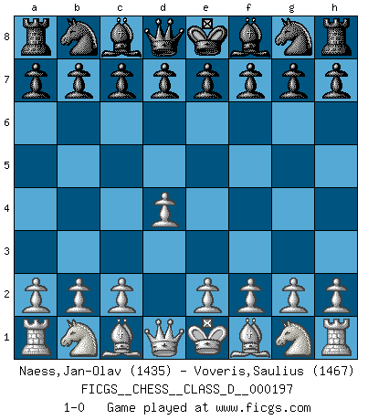 Last move : 1-0 2013 October 19 16:37:58 [Event "FICGS__CHESS__CLASS_D__000197"] [Site "FICGS"] [Date "2013.09.09"] [Round "1"] [White "Naess,Jan-Olav"] [Black "Voveris,Saulius"] [Result "1-0"] [WhiteElo "1435"] [BlackElo "1467"] 1.d4 1-0 This chess game has been lost on time (started : 2013.09.09 15:23:29) Queen's pawn Player White won this chess game. Follow this game move after move (download)A man that will take back a move at Chess will pick a pocket. (Richard Fenton) Ein Springer auf f6 gegen die eigene Rochadestellung ist schlimmer als ein rostiger Nagel im Knie. (Efim Bogoljubov) Creo que una cierta cantidad de temperamento es esperada de los genios del Ajedrez. (Ron Gross) Même si vous avez un bon coup à faire, regardez toujours s'il n'y en a pas un qui lui soit préférable. (Pedro Damiano) To steal ideas from one person is plagiarism. To steal from many is research. (Unknown)