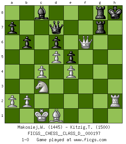 Last move : 1-0 2014 January 29 20:24:35 [Event "FICGS__CHESS__CLASS_D__000197"] [Site "FICGS"] [Date "2013.09.09"] [Round "1"] [White "Makosiej,Wladyslaw"] [Black "Kitzig,Tobias"] [Result "1-0"] [WhiteElo "1445"] [BlackElo "1500"] 1.d4 Nf6 2.c4 g6 3.Nc3 Bg7 4.e4 d6 5.f3 Nbd7 6.Be3 O-O 7.Nge2 Re8 8.Qd2 b6 9.g4 e5 10.d5 Bb7 11.Ng3 Nc5 12.h4 Qd7 13.h5 Re7 14.hxg6 fxg6 15.Be2 Rf8 16.O-O-O Ref7 17.Bh6 c6 18.Rh2 cxd5 19.Bxg7 Kxg7 20.Rdh1 Kg8 21.exd5 Re8 22.Nge4 Ncxe4 23.fxe4 Nxg4 24.Rg2 Nf6 25.Qh6 Bc8 26.Bd1 Kh8 27.Qxg6 Rg8 28.Rxh7+ Rxh7 29.Qxf6+ Rhg7 30.Rh2+ 1-0 King's Indian : Saemisch variation Kingside Castling by player Black (move 6) Queenside Castling by player White (move 16) Player White won this chess game. Follow this game move after move (download)The enormous mental resilience, without which no Chess player can exist, was so much taken up by Chess that he could never free his mind of this game. (Albert Einstein) Das Schach ist nichts für kleine Geister, es beansprucht einen vollen Mann, der sich nicht sklavisch an das Überlieferte hält, sondern selbständig die Tiefen des Spiels zu ergründen sucht. (Wilhelm Steinitz) Cualquier cambio de material en una posición debe venir por medio de un mate, una captura o promoción de Peón. (Purdy) Les Echecs ont trois composantes : le temps, l'espace et le matériel en dernier. (Mikhail Tal) The only sure thing about luck is that it will change. (Wilson Mizner)