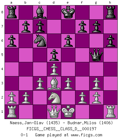 Last move : 0-1 2013 December 8 21:2:0 [Event "FICGS__CHESS__CLASS_D__000197"] [Site "FICGS"] [Date "2013.09.09"] [Round "1"] [White "Naess,Jan-Olav"] [Black "Budnar,Milos"] [Result "0-1"] [WhiteElo "1435"] [BlackElo "1406"] 1.d4 Nf6 2.Bg5 e6 3.Nf3 h6 4.Bh4 Be7 5.e3 Ne4 6.Bg3 d5 7.c3 Nc6 8.Bd3 a6 9.Nbd2 Nxg3 10.hxg3 Bg5 11.Nxg5 Qxg5 0-1 This chess game has been lost on time (started : 2013.09.09 15:23:29) Trompowsky attack (Ruth, Opovcensky Opening) Player Black won this chess game. Follow this game move after move (download)Chess books should be used as we use glasses: to assist the sight, although some players make use of them as if they thought they conferred sight. (Jose Raul Capablanca) Wenn sie aufgeben, dann danke ich Ihnen für das Spiel (Eventualzug beim Fernschach). (Anonymous) Diferente gente reacciona diferentemente en aceptar la derrota. (Bobby Fischer) Les échecs sont plus proches de l'art de l'assassinat que de l'art de la guerre. (Arturo Perez-Reverte) Programming can only do so much before it becomes too much. (Don Groves)