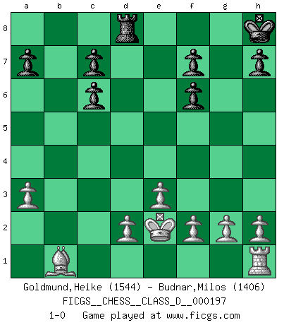 Last move : 1-0 2013 October 6 20:58:15 [Event "FICGS__CHESS__CLASS_D__000197"] [Site "FICGS"] [Date "2013.09.09"] [Round "1"] [White "Goldmund,Heike"] [Black "Budnar,Milos"] [Result "1-0"] [WhiteElo "1544"] [BlackElo "1406"] 1.b4 e5 2.Bb2 Bxb4 3.Bxe5 Nf6 4.c4 O-O 5.a3 Be7 6.Nf3 d6 7.Bb2 Bg4 8.e3 d5 9.cxd5 Qxd5 10.Nc3 Bxf3 11.Nxd5 Bxd1 12.Nxe7+ Kh8 13.Rxd1 Nc6 14.Nxc6 bxc6 15.Bxf6 gxf6 16.Rb1 Rab8 17.Bd3 Rxb1 18.Bxb1 Rd8 19.Ke2 1-0 Polish (Sokolsky) opening Kingside Castling by player Black (move 4) Player White won this chess game. Follow this game move after move (download)Man is a frivolous, a specious creature, and like a Chess player, cares more for the process of attaining his goal than for the goal itself. (Dostoyevsky) Es ist wirklich schade, dass so viele Schachspieler nicht auf ihr Äußeres achten! (Alexandra Kosteniuk) El Ajedrez es una manera fabulosa para que los niños aprendan a autovalorarse y a autoestimarse. (Saudin Robovic) Toute estimation doit être constamment réévaluée. (Jacob Estrin) Question: Is 'This statement is paradoxical' a paradoxical statement ? Or is it a meta-paradox ? (Normajean Yates)