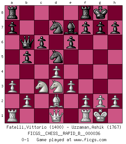 Last move : 0-1 2007 April 4 21:47:37 [Event "FICGS__CHESS__RAPID_B__000036"] [Site "FICGS"] [Date "2007.02.06"] [Round "1"] [White "Fatelli,Vittorio"] [Black "Uzzaman,Ashik"] [Result "0-1"] [WhiteElo "1400"] [BlackElo "1767"] 1.d4 d5 2.Nf3 Nf6 3.a3 Bf5 4.e3 e6 5.c4 c6 6.Nc3 Be7 7.Be2 dxc4 8.Bxc4 Qa5 9.Ne5 b5 10.Be2 Nd5 11.Bd2 Qb6 12.Bd3 Bxd3 13.Nxd3 Nd7 14.O-O O-O 0-1 This chess game has been lost on time (started : 2007.02.06 2:54:37) Queen's pawn game Kingside Castling by player White (move 14) Kingside Castling by player Black (move 14) Player Black won this chess game. Follow this game move after move (download)Chess is war over the board. The object is to crush the opponents mind. (Bobby Fischer) Pläne sind die Träume des Verständigen. (Ernst Freiherr von Feuchtersleben) El Ajedrez hace al hombre ser mas sabio y ver mas claro. (Vladimir Putin) On a dit que l'homme se distingue de l'animal par le fait qu'il achète plus de livres qu'il ne peut en lire. Je voudrais suggérer qu'inclure à la liste des livres quelques livres d'échecs rendrait la distinction manifeste. (Edward Lasker) I would love to change the world, but they won't give me the source code. (Unknown)