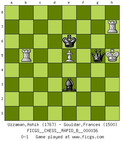 Last move : 0-1 2007 May 8 21:14:40 [Event "FICGS__CHESS__RAPID_B__000036"] [Site "FICGS"] [Date "2007.02.06"] [Round "1"] [White "Uzzaman,Ashik"] [Black "Gouldar,Frances"] [Result "0-1"] [WhiteElo "1767"] [BlackElo "1500"] 1.e4 c5 2.Nf3 d6 3.d4 cxd4 4.Nxd4 Nf6 5.Nc3 g6 6.Bc4 Bg7 7.O-O O-O 8.Bb3 Bd7 9.Kh1 Nc6 10.Be3 Nxd4 11.Bxd4 a5 12.a4 e5 13.Be3 Bc6 14.f3 Qc7 15.Qd3 Rfd8 16.Rfd1 Rd7 17.Rd2 Rad8 18.Rad1 d5 19.exd5 Nxd5 20.Bxd5 Bxd5 21.Nxd5 Rxd5 22.Qxd5 Rxd5 23.Rxd5 h5 24.c3 Qc4 25.Rxa5 Qe2 26.Rd8+ Kh7 27.Bg1 Qxb2 28.Rc8 e4 29.fxe4 Bxc3 30.Rac5 Bd4 31.Rc2 Qb6 32.a5 Qa7 33.R8c7 Bxg1 34.Rxf7+ Kh6 35.R2c7 Bf2 36.g3 Qxa5 37.Kg2 Bb6 38.Rxb7 Qd2+ 39.Kh3 Bg1 40.Rh7+ Kg5 41.Rb5+ Kf6 42.e5+ Ke6 43.Kh4 Qxh2+ 44.Kg5 Be3+ 45.Kxg6 Qxg3+ 46.Kxh5 Qg5+ 0-1 Sicilian : Dragon variation Kingside Castling by player White (move 7) Kingside Castling by player Black (move 7) 10 pieces endgame at move 43 : White KRRPP , Black KQBPP WHITE : King + 2 Rooks 2 Pawns BLACK : King + 1 Queen 1 Bishop 2 Pawns 9 pieces endgame at move 45 : White KRRPP , Black KQBP WHITE : King + 2 Rooks 2 Pawns BLACK : King + 1 Queen 1 Bishop 1 Pawn 8 pieces endgame at move 45 : White KRRP , Black KQBP WHITE : King + 2 Rooks 1 Pawn BLACK : King + 1 Queen 1 Bishop 1 Pawn 7 pieces endgame at move 46 : White KRRP , Black KQB WHITE : King + 2 Rooks 1 Pawn BLACK : King + 1 Queen 1 Bishop Player Black won this chess game. Follow this game move after move (download)There just isn't enough televised Chess. (David Letterman) Ein Schachgenie ist jemand der verdammt gut Schach spielt. (Jonathan Levitt) ¿Se han dado cuenta de que Fischer casi nunca ha tenido piezas malas? El las intercambia y las piezas malas se quedan con sus oponenets. (Yuri Balashov) C'est une question de caractère, Beaucoup de gens perdent leur motivation très vite. D'autres, ils sont rares, peuvent la conserver très longtemps. J'aime les échecs, encore aujourd'hui je suis heureux d'analyser des parties. J'aime toujours gagner, je déteste encore perdre. Bien jouer est important pour mon intégrité intellectuelle et morale. Et puis les échecs vivent en ce moment une période historique grâce à Internet. Ils se développent dans les systèmes éducatifs à travers le monde. Ils sortent de leur ghetto, et c'est mon rôle de mener à bien cette révolution. (Gary Kasparov) Life is pleasant. Death is peaceful. It's the transition that's troublesome. (Isaac Asimov)