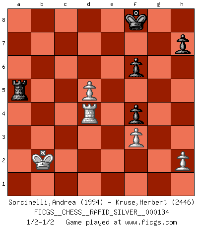 Last move : 1/2-1/2 2013 September 28 5:6:3 [Event "FICGS__CHESS__RAPID_SILVER__000134"] [Site "FICGS"] [Date "2013.09.10"] [Round "2"] [White "Sorcinelli,Andrea"] [Black "Kruse,Herbert"] [Result "1/2-1/2"] [WhiteElo "1994"] [BlackElo "2446"] 1.e4 c5 2.Nf3 d6 3.d4 cxd4 4.Nxd4 Nf6 5.Nc3 a6 6.Be3 e5 7.Nb3 Be7 8.f3 Be6 9.Qd2 O-O 10.O-O-O Nbd7 11.g4 b5 12.g5 Nh5 13.Nd5 Bxd5 14.exd5 f6 15.gxf6 Bxf6 16.Na5 Nf4 17.Nc6 Qc7 18.c4 Nb8 19.Qa5 Qb7 20.cxb5 axb5 21.Qxb5 Qxb5 22.Bxb5 Rxa2 23.Kb1 Ra8 24.Bxf4 exf4 25.Rhe1 Na6 26.Bxa6 Rxa6 27.Re6 Rb6 28.b4 Ra8 29.Kc2 Ra3 30.Rxd6 Kf8 31.Rxf6+ gxf6 32.Kb2 Rba6 33.Na5 R3xa5 34.bxa5 Rxa5 35.Rd4 1/2-1/2 Sicilian : Najdorf, Byrne (English) attack Kingside Castling by player Black (move 9) Queenside Castling by player White (move 10) 10 pieces endgame at move 34 : White KRPPP , Black KRPPP WHITE : King + 1 Rook 3 Pawns BLACK : King + 1 Rook 3 Pawns This chess game ended in a draw. Follow this game move after move (download)Nonsense was the last thing Fischer was interested in, as far as Chess was concerned. (Elie Agur) Du musst nicht gut spielen, es reicht, wenn du besser spielst als dein Gegner. (Anonymous) El Ajedrez por encima de todo... ¡es una pelea!. (Emanuel Lasker) Un journaliste : 'Vous préférez avoir une dame de plus sur l'échiquier ou au lit ?' Boris Spassky : 'Ca dépend de la position.' If only people were all showed a certain minimum level of niceness; if only people didn't retract verbal draw offers (without draw box ticked) on ficgs; if only people didn't kill; if only people didn't run concentration / extermination camps, if only people didn't drop nuclear bombs on Hiroshima and Nagasaki, and so on - it would be a much more beautiful world. But sadly, things are not so... (Normajean Yates)