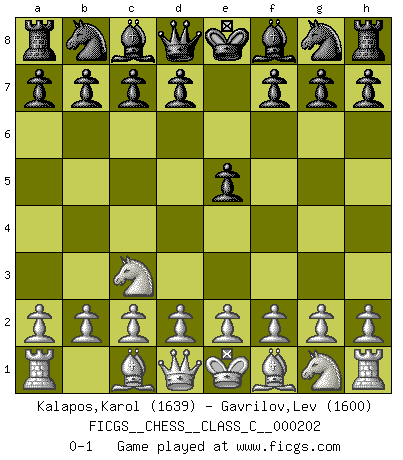Last move : 0-1 2013 November 10 18:24:38 [Event "FICGS__CHESS__CLASS_C__000202"] [Site "FICGS"] [Date "2013.09.11"] [Round "1"] [White "Kalapos,Karol"] [Black "Gavrilov,Lev"] [Result "0-1"] [WhiteElo "1639"] [BlackElo "1600"] 1.Nc3 e5 0-1 This chess game has been lost on time (started : 2013.09.11 12:9:23) Dunst (Sleipner-Heinrichsen) Opening Player Black won this chess game. Follow this game move after move (download)If you aren't afraid of Spassky, then I have removed the element of money. (Jim Slater) Wenn ich gewinne bin ich ein Genie. Wenn nicht, dann bin ich keines. (Robert James Fischer) Hoy en día, si tu no eres un Gran Maestro a los 14 años, es mejor que lo olvides. (Anand Viswanathan) La vérité est comme le meilleur coup aux échecs : elle existe, mais il faut la chercher. (Arturo Perez-Reverte) For to win one hundred victories in one hundred battles is not the acme of skill. To subdue the enemy without fighting is the acme of skill. (Sun Tzu)