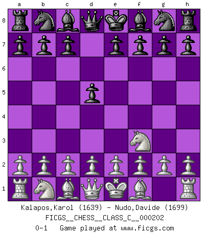 Last move : 0-1 2013 November 6 18:14:37 [Event "FICGS__CHESS__CLASS_C__000202"] [Site "FICGS"] [Date "2013.09.11"] [Round "1"] [White "Kalapos,Karol"] [Black "Nudo,Davide"] [Result "0-1"] [WhiteElo "1639"] [BlackElo "1699"] 1.Nf3 d5 0-1 This chess game has been lost on time (started : 2013.09.11 12:9:23) Reti Opening Player Black won this chess game. Follow this game move after move (download)All I want to do, ever, is just play Chess. (Bobby Fischer) Es ist wirklich schade, dass so viele Schachspieler nicht auf ihr Äußeres achten! (Alexandra Kosteniuk) ¿Quién es tu oponente esta tarde? Esta tarde mi oponente son las piezas negras. (Akiba Rubinstein) En blitz, le Cavalier l'emporte sur le Fou. (Vlastimil Hort) Think like a man of action, act like a man of thought. (Henri Louis Bergson)