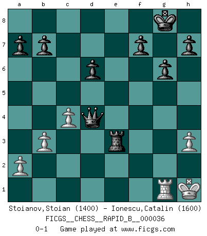 Last move : 0-1 2007 February 26 19:59:31 [Event "FICGS__CHESS__RAPID_B__000036"] [Site "FICGS"] [Date "2007.02.06"] [Round "1"] [White "Stoianov,Stoian"] [Black "Ionescu,Catalin"] [Result "0-1"] [WhiteElo "1400"] [BlackElo "1600"] 1.e4 c5 2.Nf3 d6 3.d4 cxd4 4.Nxd4 Nc6 5.Be3 Nf6 6.Nc3 e5 7.Bb5 Bd7 8.Bxc6 Bxc6 9.Qf3 exd4 10.Bxd4 Be7 11.O-O O-O 12.Ne2 Nxe4 13.Qg4 Bf6 14.f3 Bxd4+ 15.Nxd4 Nf6 16.c4 Nxg4 17.fxg4 Qg5 18.Rad1 Qxg4 19.Rd2 Rfe8 20.h3 Qh4 21.Nf5 Qg5 22.Rdf2 Rad8 23.Nd4 Bxg2 24.Rxg2 Qe3+ 25.Kh1 Qxd4 26.Rfg1 g6 27.b3 Re3 28.Kh2 Rde8 29.Rg4 Re2+ 30.Kh1 R8e4 31.R4g3 R4e3 32.Rxe3 Rxe3 0-1 Sicilian Kingside Castling by player White (move 11) Kingside Castling by player Black (move 11) Player Black won this chess game. Follow this game move after move (download)What is the difference between chess and football? Everybody understands football, but nobody plays it. Everybody plays chess, but nobody understands it. Everything is relative. (Vladimir Kramnik) Der Freibauer hat für mich eine Seele, genau wie der Mensch, Wünsche, die unerkannt in ihm schlummern, und Befürchtungen, von deren Existenz er selbst kaum ahnt. (Aaron Nimzowitsch) Es el objetivo de la escuela moderna no tratar cada posición de acuerdo a una regla general, sino de acuerdo al principio inherente en la posición. (Richard Reti) On est toujours la mazette de quelqu'un d'autre. (Anonyme) Everything in life is luck. (Donald Trump)