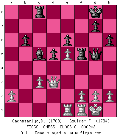 Last move : 0-1 2014 January 15 14:25:31 [Event "FICGS__CHESS__CLASS_C__000202"] [Site "FICGS"] [Date "2013.09.11"] [Round "1"] [White "Gadhesariya,Divyesh"] [Black "Gouldar,Frances"] [Result "0-1"] [WhiteElo "1703"] [BlackElo "1784"] 1.d4 d5 2.c4 e6 3.Nc3 Nf6 4.c5 b6 5.cxb6 axb6 6.Bg5 Be7 7.Nf3 O-O 8.e3 Ba6 9.Bxa6 Nxa6 10.O-O c5 11.Ne5 Rc8 12.Qa4 cxd4 13.exd4 Nc7 14.Qc2 Nb5 15.Qd3 Nxc3 16.bxc3 h6 17.Bf4 Bd6 18.Qe3 Nh5 19.Rac1 Nxf4 20.Qxf4 f6 21.Qe3 fxe5 22.dxe5 Bc5 23.Qd3 Qg5 24.Rce1 Rf5 0-1 Comment by player 2 : Frances Gouldar : Hello and good game ! QGD : 3...Nf6 Kingside Castling by player Black (move 7) Kingside Castling by player White (move 10) Player Black won this chess game. Follow this game move after move (download)It began to feel as though you were playing against Chess itself. - On playing against Robert Fischer. (Walter Shipman) Als er Schachweltmeister wurde ließ er praktisch alle stärksten Sovietspieler für sich arbeiten. Wenn ein auch nur mittelmässiger Meister ein Spezialist für eine bestimmte Eröffnung war, wurde er von Karpov gerufen. Das wurde alles geheim gehalten. (Mikhail Moiseyevich Botvinik) Cuando tu casa esta en llamas, no puedes ser molestado por tus vecinos. O, como decinos en Ajedrez, si tu Rey esta bajo ataque, no te preocupa perder un Peón del lado de la Reina. (Gary Kasparov) Des idées, des idées, j'en ai cent, j'en ai mille. Des bonnes, des mauvaises, applicables, irréalisables... Il suffit de faire le tri ! (Roos) In fact if nothing is done against this teddy bear, hereby I announce that I would quit chess, rapid chess, blitz chess, postal chess, email chess, server chess and correspondence chess I will then switch to a table game where teddy bears aren't going to be seen for a while, like Poker, or Roulette, all 18+ games. (Elmer Valderrama)