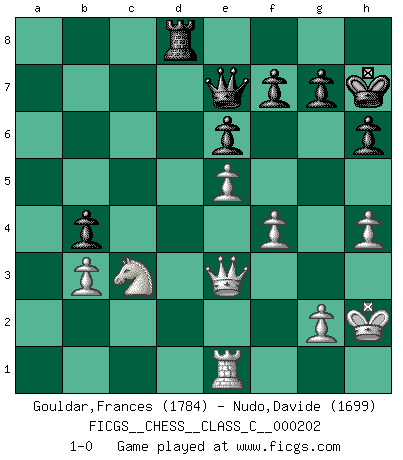Last move : 1-0 2014 September 30 20:44:28 [Event "FICGS__CHESS__CLASS_C__000202"] [Site "FICGS"] [Date "2013.09.11"] [Round "1"] [White "Gouldar,Frances"] [Black "Nudo,Davide"] [Result "1-0"] [WhiteElo "1784"] [BlackElo "1699"] 1.e4 c6 2.d4 d5 3.e5 e6 4.Nf3 c5 5.Bb5+ Bd7 6.Bxd7+ Nxd7 7.O-O Ne7 8.Nc3 a6 9.Be3 Nc6 10.dxc5 Bxc5 11.Bxc5 Nxc5 12.Re1 O-O 13.a3 Rc8 14.Qd2 Qb6 15.Rab1 Nd7 16.Re2 h6 17.Na4 Qc7 18.Rbe1 b5 19.Nc3 Nb6 20.Qc1 Rfd8 21.Na2 Na4 22.h3 a5 23.c3 Qb6 24.Qf4 d4 25.cxd4 Nxd4 26.Nxd4 Rxd4 27.Qf3 b4 28.axb4 axb4 29.b3 Nc5 30.Nc1 Rcd8 31.Kh2 Qb8 32.Qg3 Qb7 33.Re3 Qd5 34.Ne2 Re4 35.Nc1 Qd4 36.f4 Kh7 37.Rxe4 Nxe4 38.Qe3 Nc3 39.h4 Qd7 40.Ne2 Qe7 41.Nxc3 1-0 Comment by player 1 : Frances Gouldar : Ciao e buona partita ! Caro-Kann : Advance variation Kingside Castling by player White (move 7) Kingside Castling by player Black (move 12) Player White won this chess game. Follow this game move after move (download)Chess is a more highly symbolic game, but the aggressions are therefore even more frankly represented in the play. It probably began as a war game; that is, the representation of a miniature battle between the forces of two kingdoms. (Karl Meninger) Frage: Gibt es etwas was Sie mehr lieben als Autobahnen ohne Tempobegrenzungen? - Antwort: Deutsche Frauen ohne Tempobegrenzungen. (Loek van Wely) Personalmente, yo prefiero mirar hacia el futuro en donde un programa de computadora gane el título mundial de Ajedrez. La humanidad necesita una lección de humildad. (Richard Dawkings) C'est la seule position que je connaisse où les deux camps sont mals. Propos prêtés à V. Anand. Pushing plastic is for the many, pushing virtual pieces is for the fewer, pushing wood is for the very few. (Normajean Yates)