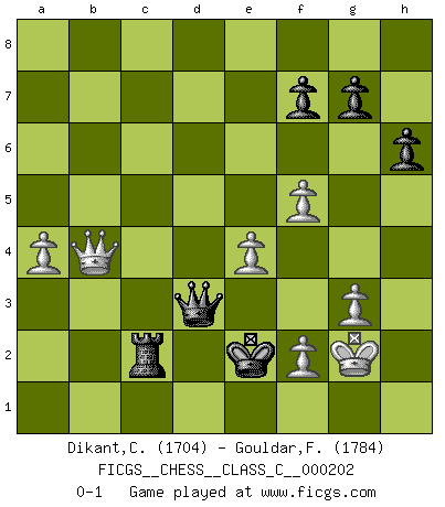 Last move : 0-1 2014 September 18 17:28:41 [Event "FICGS__CHESS__CLASS_C__000202"] [Site "FICGS"] [Date "2013.09.11"] [Round "1"] [White "Dikant,Christophe"] [Black "Gouldar,Frances"] [Result "0-1"] [WhiteElo "1704"] [BlackElo "1784"] 1.d4 d5 2.Nf3 Bf5 3.Bf4 e6 4.c4 Nf6 5.Nc3 Bb4 6.Qb3 Nc6 7.e3 O-O 8.c5 Ne4 9.Bb5 Bxc3+ 10.bxc3 Ne7 11.Be2 b6 12.cxb6 axb6 13.O-O Ng6 14.Bg3 Nxg3 15.hxg3 Qd6 16.a4 Ra5 17.c4 dxc4 18.Bxc4 Be4 19.Rfc1 Bxf3 20.gxf3 e5 21.Rd1 exd4 22.Rxd4 Qf6 23.f4 Rfa8 24.Bf1 h6 25.Rad1 Nf8 26.Bg2 Ne6 27.Bxa8 Nxd4 28.Rxd4 Rxa8 29.Qd5 Ra5 30.Qe4 Qg6 31.Qe8+ Kh7 32.e4 Rc5 33.Rd8 Rc1+ 34.Kg2 Qh5 35.Qg8+ Kg6 36.f5+ Kf6 37.Rd6+ cxd6 38.Qd8+ Ke5 39.Qe7+ Kd4 40.Qxd6+ Kc3 41.Qa3+ Kc2 42.Qa2+ Kd1 43.Qb3+ Kd2 44.Qb2+ Rc2 45.Qxb6 Qe2 46.Qd4+ Qd3 47.Qb4+ Ke2 0-1 Comment by player 2 : Frances Gouldar : Hello and good game ! Queen's pawn game Kingside Castling by player Black (move 7) Kingside Castling by player White (move 13) Player Black won this chess game. Follow this game move after move (download)All my games are real. (Bobby Fischer) Heutzutage gewinnt im Turnier nicht derjenige Spieler, der weitreichende Pläne entwirft, sondern einfach jener, der Zug um Zug kämpft. (David Bronstein) El Ajedrez lo es todo: arte, ciencia y deporte. (Anatoly Karpov) Les échecs, c'est la lutte contre l'erreur. (Johannes Zukertort) Every now and then a man's mind is stretched by a new idea and never shrinks back to its former dimensions. (Oliver Wendell Holmes, Sr.)