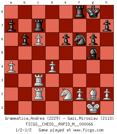 Last move : 1/2-1/2 2013 December 19 20:48:32 [Event "FICGS__CHESS__RAPID_M__000066"] [Site "FICGS"] [Date "2013.09.11"] [Round "1"] [White "Grammatica,Andrea"] [Black "Gazi,Miroslav"] [Result "1/2-1/2"] [WhiteElo "2229"] [BlackElo "2113"] 1.d4 Nf6 2.c4 e6 3.g3 d5 4.Nf3 Bb4+ 5.Bd2 Be7 6.Bg2 O-O 7.O-O Nbd7 8.Qc2 c6 9.Bf4 b6 10.Rd1 Bb7 11.Nc3 dxc4 12.Nd2 Nd5 13.Nxc4 Nxf4 14.gxf4 Qc7 15.e3 Rfd8 16.a3 Rac8 17.b4 Nf8 18.f5 Ba6 19.Ne5 c5 20.fxe6 fxe6 21.Nc6 cxd4 22.exd4 Re8 23.b5 Bb7 24.Rd3 Ng6 25.Rh3 Qf4 26.Be4 Qg4+ 27.Rg3 Qh5 28.Qe2 Nf4 29.Qxh5 Nxh5 30.Re3 Bg5 31.Rd3 Rf8 32.a4 Bh4 33.Ra2 g6 34.Rh3 Bf6 35.Ne2 Rc7 36.Rc2 Bg5 37.Rhc3 Bxc6 38.bxc6 Nf6 39.Bg2 1/2-1/2 Catalan Opening Kingside Castling by player Black (move 6) Kingside Castling by player White (move 7) This chess game ended in a draw. Follow this game move after move (download)Half the variations which are calculated in a tournament game turn out to be completely superfluous. Unfortunately, no one knows in advance which half. (Jan Tinman) Über Karpov: Er war und ist ein Vertreter der russischen Reaktionäre. Das steckt tief in seiner Seele, wehalb ich nicht nett mit ihm umgehen kann. (Viktor Kortschnoi) Todo lo que importa ante el tablero de Ajedrez son buenas jugadas. (Bobby Fischer) Le pion, dans sa simplicité, marche droit devant lui, mais lorsqu'il prend, il le fait obliquement? Ainsi l'homme, tant qu'il reste pauvre, marche dans la droiture et vit honnêtement, mais lorsqu'il recherche les honneurs, il flatte, se parjure et, par les voies obliques, cherche une position supérieure sur l'échiquier du monde. (Jean de Galles) Don't be discouraged. It's often the last key in the bunch that opens the lock. (Author unknown)