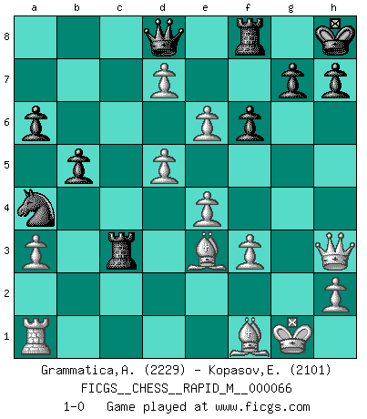 Last move : 1-0 2013 December 19 19:35:54 [Event "FICGS__CHESS__RAPID_M__000066"] [Site "FICGS"] [Date "2013.09.11"] [Round "1"] [White "Grammatica,Andrea"] [Black "Kopasov,Evgeny"] [Result "1-0"] [WhiteElo "2229"] [BlackElo "2101"] 1.d4 d5 2.c4 c6 3.Nf3 Nf6 4.Nc3 e6 5.e3 Nbd7 6.Bd3 dxc4 7.Bxc4 b5 8.Bd3 Bd6 9.O-O O-O 10.Qc2 Bb7 11.a3 Rc8 12.b4 c5 13.bxc5 Bxf3 14.cxd6 Nd5 15.gxf3 Nxc3 16.f4 Nf6 17.Qb2 a6 18.Bd2 Na4 19.Qb1 Qd7 20.e4 e5 21.Kh1 Qh3 22.f3 Nh5 23.fxe5 Ng3+ 24.Kg1 Nxf1 25.Qxf1 Qd7 26.Qg2 Qa7 27.Be3 Rc3 28.Qd2 Qd7 29.d5 R3c8 30.Qg2 Kh8 31.Bf1 f6 32.Qh3 Qd8 33.d7 Rc3 34.e6 1-0 QGD Slav : 4.Nc3 Kingside Castling by player White (move 9) Kingside Castling by player Black (move 9) Player White won this chess game. Follow this game move after move (download)The boy (then a 12 year old boy named Anatoly Karpov) doesn't have a clue about Chess, and there's no future at all for him in this profession. (Mikhail Botvinnik) Bis jetzt ist Weiß einer wohlbekannten Analyse gefolgt. Aber jetzt begeht er einen schrecklichen Fehler: Er beginnt seinen eigenen Kopf zu benutzen. (Siegbert Tarrasch) Un mal día en el Ajedrez, es mejor que cualquier buen día en el trabajo. (Anonymous) Les Cavaliers se révèlent fort utiles dans les positions fermées. D'habitude, les Fous sont un peu plus forts que les Cavaliers dans les positions ouvertes. Qu'on le veuille ou non, il restera toujours des exceptions ! Real knowledge is to know the extent of one's ignorance. (Confucius)