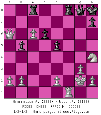 Last move : 1/2-1/2 2013 November 28 10:41:34 [Event "FICGS__CHESS__RAPID_M__000066"] [Site "FICGS"] [Date "2013.09.11"] [Round "1"] [White "Grammatica,Andrea"] [Black "Wosch,Arkadiusz"] [Result "1/2-1/2"] [WhiteElo "2229"] [BlackElo "2153"] 1.d4 Nf6 2.c4 e6 3.g3 d5 4.Nf3 Be7 5.Bg2 O-O 6.O-O dxc4 7.Qc2 a6 8.Qxc4 b5 9.Qc2 Bb7 10.Bd2 Be4 11.Qc1 Bb7 12.Bf4 Nd5 13.Nc3 Nxf4 14.Qxf4 Nd7 15.Rfd1 Bd6 16.Qe3 Qe7 17.Ne4 Bd5 18.Rac1 f5 19.Nxd6 cxd6 20.Rc7 Qd8 21.Rdc1 Nc5 22.Rxg7+ Kxg7 23.dxc5 Rc8 24.c6 e5 25.Nh4 Bxg2 26.Kxg2 f4 27.Qa7+ Kh8 28.Qxa6 fxg3 29.fxg3 Qg5 30.Rf1 Qg8 1/2-1/2 Catalan Opening Kingside Castling by player Black (move 5) Kingside Castling by player White (move 6) This chess game ended in a draw. Follow this game move after move (download)Becoming successful at Chess allows you to discover your own personality. That's what I want for the kids I teach. (Saudin Robovic) Matt entspricht nicht immer den Tatsachen. (Savielly Grigorievitsch Tartakower) Las piezas de Ajedrez son los bloques del alfabeto que moldean los pensamientos; y esos pensamientos, aunque hagan un diseño visual en el tablero, expresan abstractamente su belleza como un poema. (Marcel Duchamp) Botvinnik disait en comparant les échecs à la musique: Il existe une science dont le but est l'étude de l'acoustique et des sons. Mais il y a aussi un art qui se sert de l'océan des sons : c'est la musique. De toute évidence, il en est de même pour la pensée. La logique est l'étude des lois de la réflexion et les échecs reflètent, en tant qu'art, le côté logique de la réflexion, sous la forme d'images artistiques... Extrait de Fischer - Spassky, Reykjavik 1972 par Alexander & F. Wyndham (Ed. Solar), p 37. You must have a dream in order to have it come true. (A.P.J. Kalam)