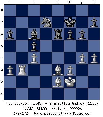 Last move : 1/2-1/2 2013 November 3 17:23:44 [Event "FICGS__CHESS__RAPID_M__000066"] [Site "FICGS"] [Date "2013.09.11"] [Round "1"] [White "Huerga,Aser"] [Black "Grammatica,Andrea"] [Result "1/2-1/2"] [WhiteElo "2145"] [BlackElo "2229"] 1.e4 c5 2.Nf3 e6 3.d4 cxd4 4.Nxd4 Nc6 5.Nc3 Qc7 6.Be3 a6 7.Be2 Nf6 8.O-O Bb4 9.Nxc6 bxc6 10.Qd4 c5 11.Qc4 Bb7 12.a3 d5 13.exd5 exd5 14.Qf4 Qxf4 15.Bxf4 Bxc3 16.bxc3 O-O 17.c4 Rfe8 18.Rfe1 d4 19.f3 Bc6 20.Bd3 g6 21.Kf2 Rac8 22.Rxe8+ Rxe8 23.c3 Rd8 24.Rc1 dxc3 25.Rxc3 Nd7 26.Rb3 f6 27.Be2 Kf7 28.h4 Re8 29.g4 Re6 30.Be3 1/2-1/2 Sicilian : Taimanov variation Kingside Castling by player White (move 8) Kingside Castling by player Black (move 16) This chess game ended in a draw. Follow this game move after move (download)Chess, like love, is infectious at any age. (Flohr) Ein Gewinn durch eine ungenaue Kombination, sei sie auch noch so vorzeigbar, erfüllt mich mit Schaudern. (Wilhelm Steinitz) Solo los afeminados hacen el Enroque. (Rob Sillars) On croit qu'il y a plus de mauvais joueurs que de bons joueurs, c'est faux : Il y a autant de joueurs qui gagnent que de joueurs qui perdent. (Philippe Geluck) Strategy without tactics is the slowest route to victory. Tactics without strategy is the noise before defeat. (Sun Tzu)
