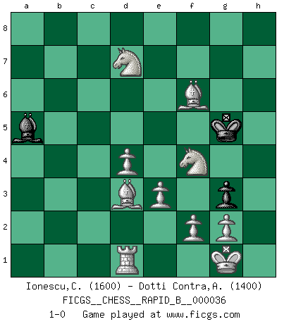 Last move : 1-0 2007 April 2 20:58:44 [Event "FICGS__CHESS__RAPID_B__000036"] [Site "FICGS"] [Date "2007.02.06"] [Round "1"] [White "Ionescu,Catalin"] [Black "Dotti Contra,Alessandro"] [Result "1-0"] [WhiteElo "1600"] [BlackElo "1400"] 1.d4 d5 2.c4 e6 3.Nc3 Nf6 4.Bg5 Bb4 5.cxd5 exd5 6.e3 O-O 7.Qb3 Nc6 8.a3 Ba5 9.Bd3 h6 10.Bh4 Be6 11.Qxb7 Rb8 12.Qxc6 Rxb2 13.Nge2 Qe7 14.O-O Rd2 15.Rfd1 Rxd1+ 16.Rxd1 g5 17.Bg3 Rb8 18.Nb5 a6 19.Nxc7 Qd7 20.Qxd7 Bxd7 21.Nxd5 Rb3 22.Nxf6+ Kg7 23.Nxd7 Rxa3 24.Bxa6 f6 25.h3 h5 26.Bd6 Kg6 27.Bxa3 g4 28.Nf4+ Kf5 29.hxg4+ hxg4 30.Bd3+ Kg5 31.Be7 g3 32.Bxf6+ 1-0 QGD : 4.Bg5 Kingside Castling by player Black (move 6) Kingside Castling by player White (move 14) Player White won this chess game. Follow this game move after move (download)The blunders are all there on the board, waiting to be made. (Savielly Tartakover) Intelligenz läßt sich nicht am Weg, sondern nur am Ergebnis feststellen. (Garry Kasparov) Si tu oponente no puede hacer nada activo, entonces no apures la posición; En vez de eso, dejalo estar sentado ahí, sufriendo y rogandote por un empate. (Jeremy Silman) La tactique est l'élément le plus important du milieu de jeu. (Siegbert Tarrasch) Faith : not wanting to know what is true. (Friedrich Nietzsche)