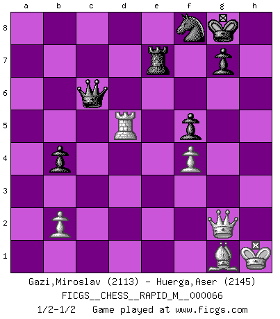 Last move : 1/2-1/2 2014 January 4 18:38:3 [Event "FICGS__CHESS__RAPID_M__000066"] [Site "FICGS"] [Date "2013.09.11"] [Round "1"] [White "Gazi,Miroslav"] [Black "Huerga,Aser"] [Result "1/2-1/2"] [WhiteElo "2113"] [BlackElo "2145"] 1.d4 d5 2.c4 c6 3.Nf3 Nf6 4.Nc3 dxc4 5.a4 Bf5 6.e3 e6 7.Bxc4 Bb4 8.O-O O-O 9.Qe2 Nbd7 10.e4 Bg6 11.Bd3 Bh5 12.e5 Nd5 13.Nxd5 cxd5 14.Qe3 Re8 15.Ng5 Bg6 16.Bxg6 hxg6 17.Bd2 Be7 18.f4 Rc8 19.a5 Nf8 20.Rae1 Qd7 21.Bc3 Rc6 22.Rf3 Rec8 23.Qe2 Qd8 24.Rg3 f5 25.Ra1 Nh7 26.Nh3 Qe8 27.Qd2 R8c7 28.Nf2 Nf8 29.Nd3 Rc8 30.Ne1 R8c7 31.Rd1 Rc4 32.Kh1 Rc8 33.Nd3 R8c7 34.Ra1 R4c6 35.Qe3 Rc4 36.Rh3 Rc8 37.Rf3 R8c7 38.Rg1 Rc8 39.h3 R4c7 40.g4 Rc4 41.gxf5 exf5 42.Rfg3 Bh4 43.R3g2 Qb5 44.Nf2 R4c6 45.Nd1 R8c7 46.Qf3 Rd7 47.Ne3 Bd8 48.Rd1 Ra6 49.h4 Bxh4 50.Nc2 Qb3 51.Rh2 Be7 52.Rg1 b5 53.axb6 axb6 54.Qe2 b5 55.Rh3 Rc6 56.Ne3 b4 57.Be1 Rc1 58.Qg2 Qd3 59.e6 Rb7 60.Nxd5 Qxd4 61.Bf2 Qd2 62.Rxc1 Qxc1+ 63.Bg1 Nxe6 64.Qxg6 Qc6 65.Qg2 Qd7 66.Rd3 Qb5 67.Rd2 Nf8 68.Nxe7+ Rxe7 69.Rd5 Qc6 1/2-1/2 QGD Slav : Dutch variation Kingside Castling by player White (move 8) Kingside Castling by player Black (move 8) This chess game ended in a draw. Follow this game move after move (download)We like to think. (Gary Kasparov) Ich tröste mich mit dem Vergnügen, daß Schachfans, Zuschauer und Leser glücklich sind, wenn ein Großmeister etwas riskiert, statt nur Klötzchen zu schieben. (Mikhail Nekhemyevich Tal) Aquel que ve no otra dirección en el juego que la de dar Jaque Mate a su oponente, nunca será un buen jugador de Ajedrez. (Euwe) Le plus grand jeu de l'esprit jamais inventé, plus vous l'apprenez, plus vous y prenez du plaisir. (Garry Kasparov) Life is like internet, nothing interesting, but noone want to leave it. (Ilmars Cirulis)