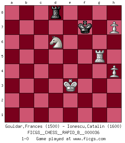 Last move : 1-0 2007 April 18 16:14:37 [Event "FICGS__CHESS__RAPID_B__000036"] [Site "FICGS"] [Date "2007.02.06"] [Round "1"] [White "Gouldar,Frances"] [Black "Ionescu,Catalin"] [Result "1-0"] [WhiteElo "1500"] [BlackElo "1600"] 1.d4 d5 2.c4 c6 3.cxd5 cxd5 4.Bf4 e6 5.Nc3 Bb4 6.Bxb8 Rxb8 7.Qa4+ Bd7 8.Qxb4 a5 9.Qd6 Bc6 10.Qxd8+ Rxd8 11.Nf3 f6 12.e3 Ne7 13.Bb5 O-O 14.Bxc6 Nxc6 15.O-O Na7 16.Rad1 b5 17.a3 Rb8 18.Rfe1 Rfe8 19.e4 dxe4 20.Nxe4 Nc6 21.d5 exd5 22.Rxd5 b4 23.axb4 Nxb4 24.Rxa5 Nd3 25.Re3 Nxb2 26.Ned2 Rxe3 27.fxe3 Nd1 28.e4 Nc3 29.e5 Ne2+ 30.Kf2 Nf4 31.exf6 gxf6 32.Rf5 Nd3+ 33.Ke2 Nc1+ 34.Kd1 Nb3 35.Rxf6 Nxd2 36.Nxd2 Rb2 37.Kc1 Ra2 38.Rf2 Kg7 39.g4 h6 40.h4 Ra4 41.Rg2 Ra5 42.g5 Rc5+ 43.Kd1 Rd5 44.Ke2 Kg6 45.Ne4 Re5 46.Kd3 Kf5 47.gxh6 Rd5+ 48.Ke3 Rd8 49.Rg5+ Ke6 50.h7 Kf7 51.Nd6+ 1-0 QGD Slav defense : Exchange variation Kingside Castling by player Black (move 13) Kingside Castling by player White (move 15) 10 pieces endgame at move 35 : White KRNNPP , Black KRNP WHITE : King + 1 Rook 2 Knights 2 Pawns BLACK : King + 1 Rook 1 Knight 1 Pawn 9 pieces endgame at move 35 : White KRNPP , Black KRNP WHITE : King + 1 Rook 1 Knight 2 Pawns BLACK : King + 1 Rook 1 Knight 1 Pawn 8 pieces endgame at move 36 : White KRNPP , Black KRP WHITE : King + 1 Rook 1 Knight 2 Pawns BLACK : King + 1 Rook 1 Pawn 7 pieces endgame at move 47 : White KRNPP , Black KR WHITE : King + 1 Rook 1 Knight 2 Pawns BLACK : King + 1 Rook Player White won this chess game. Follow this game move after move (download)One doesn't have to play well, it's enough to play better than your opponent. (Siegbert Tarrasch) Bis zum Jahr 1971 verlief in meiner Schachkariere alles glatt. Dieses dramatische Match [Fischer-Taimanov 6:0] machte mein Leben zur Hölle. (Mark Taimanov) Hasta este punto, las blancas han seguido un análisis bien conocido. Pero ahora el hace un error fatal: empieza a usar su propia cabeza. (Siegbert Tarrasch) Le thème de l'attaque double intervient d'une manière ou d'une autre dans l'immense majorité des combinaisons. (Youri Averbakh) When it is a question of money, everybody is of the same religion. (Voltaire)