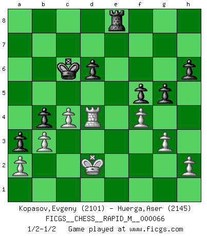 Last move : 1/2-1/2 2013 November 29 12:49:23 [Event "FICGS__CHESS__RAPID_M__000066"] [Site "FICGS"] [Date "2013.09.11"] [Round "1"] [White "Kopasov,Evgeny"] [Black "Huerga,Aser"] [Result "1/2-1/2"] [WhiteElo "2101"] [BlackElo "2145"] 1.e4 c5 2.Nf3 d6 3.d4 cxd4 4.Nxd4 Nf6 5.Nc3 a6 6.Bg5 e6 7.f4 Nbd7 8.Qf3 Qc7 9.O-O-O b5 10.Bd3 Bb7 11.Rhe1 Be7 12.Qg3 b4 13.Nd5 exd5 14.exd5 Kd8 15.Nc6+ Bxc6 16.dxc6 Nc5 17.Bh4 Rg8 18.Bf5 a5 19.Kb1 Ra7 20.Re2 g6 21.Bd7 Ncxd7 22.cxd7 Qxd7 23.Rde1 Qf5 24.Qf3 Ne4 25.Bxe7+ Rxe7 26.Rxe4 Rxe4 27.Qxe4 Qxe4 28.Rxe4 g5 29.g3 h6 30.Kc1 f5 31.Rd4 Kd7 32.Kd2 Kc6 33.c4 a4 34.Kd3 a3 35.b3 Re8 36.Kd2 1/2-1/2 Sicilian : Najdorf, 7.f4 Queenside Castling by player White (move 9) This chess game ended in a draw. Follow this game move after move (download)It is not enough to be a good player... you must also play well. (Siegbert Tarrasch) Wenn Dein Gegner dir ein Remis anbietet, versuch herauszufinden, weshalb er glaubt schlechter zu stehen. (Nigel Short) Un mal día en el Ajedrez, es mejor que cualquier buen día en el trabajo. (Anonymous) Ce qui est bien, c'est d'avoir tout un tas de pièces en prise : l'adversaire ne peut en prendre qu'une à la fois. Cité par Thierry Audin. Hello Thibault, if I have had a plan (and I had one, I hope), I have forgotten it during the last week... - Hello Heinz-Georg. What do you mean a plan ? (Anonymous players, during a Big Chess game)