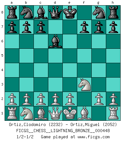 Last move : 1/2-1/2 2013 September 11 16:55:46 [Event "FICGS__CHESS__LIGHTNING_BRONZE__000448"] [Site "FICGS"] [Date "2013.09.11"] [Round "1"] [White "Ortiz,Clodomiro"] [Black "Ortiz,Miguel"] [Result "1/2-1/2"] [WhiteElo "2232"] [BlackElo "2052"] 1.f4 e5 2.fxe5 d6 3.exd6 Bxd6 4.Nf3 1/2-1/2 Bird : From gambit This chess game ended in a draw. Follow this game move after move (download)It is difficult to play against Einstein's theory --on his first loss to Fischer. (Mikhail Tal) Ich hatte meine größten Erfolge, als ich 47 Jahre alt war. Kasparow war noch nicht mal 42 und hat das Schach schon im Stich gelassen. (Viktor Kortschnoi) Los tropiezos estan todos ahí en el tablero, esperando que se cometan. (Savielly Tartakover) Le génie consiste à savoir transgresser les règles au moment opportun. (Teichmann) Man with more than one clock never knows what time it is. (Chinese thought)