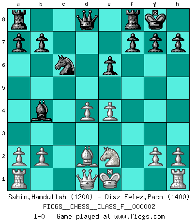 Last move : 1-0 2006 August 26 6:44:2 [Event "FICGS__CHESS__CLASS_F__000002"] [Site "FICGS"] [Date "2006.05.23"] [Round "1"] [White "Sahin,Hamdullah"] [Black "Diaz Felez,Paco"] [Result "1-0"] [WhiteElo "1200"] [BlackElo "1400"] 1.d4 d5 2.e3 Bf5 3.Bd3 e6 4.Nc3 Nf6 5.f3 Bxd3 6.cxd3 c5 7.Nge2 cxd4 8.Nxd4 Bc5 9.Nde2 O-O 10.d4 Bb4 11.Bd2 Nc6 12.e4 dxe4 13.Nxe4 Nxe4 14.fxe4 1-0 This chess game has been lost on time (started : 2006.05.23 20:17:39) Queen's pawn game Kingside Castling by player Black (move 9) Player White won this chess game. Follow this game move after move (download)A great player and a great example for many. His book My 60 Memorable Games had a big impact on me. It is a shame he didn't continue to enrich the world of chess with his unparalleled understanding after 1972. (Jan Timman, about Bobby Fischer's death) Ich bin es gewohnt, das die Jugend mir überhaupt keinen Respekt entgegenbringt. (Alexander Morozewich) Una victoria por una combinación errónea, aunque sea espectacular, me llena de horror artístico. (Wilhelm Steinitz) La tactique, c'est ce que vous faites quand il y a quelque chose à faire; la stratégie, c'est ce que vous faites quand il n'y a rien à faire. (Savielli Tartacower) Every now and then a man's mind is stretched by a new idea and never shrinks back to its former dimensions. (Oliver Wendell Holmes, Sr.)