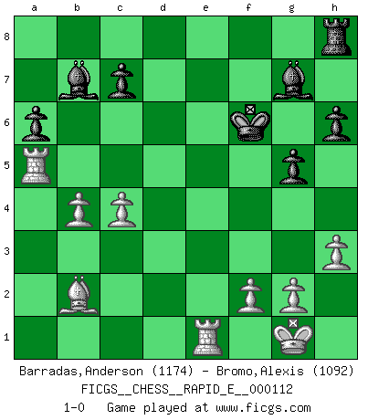 Last move : 1-0 2013 September 15 19:24:7 [Event "FICGS__CHESS__RAPID_E__000112"] [Site "FICGS"] [Date "2013.09.14"] [Round "1"] [White "Barradas,Anderson"] [Black "Bromo,Alexis"] [Result "1-0"] [WhiteElo "1174"] [BlackElo "1092"] 1.e4 e5 2.Nf3 Nc6 3.Bb5 d6 4.O-O h6 5.c3 a6 6.Bxc6+ bxc6 7.d3 Bb7 8.Re1 c5 9.Qa4+ Qd7 10.Qxd7+ Kxd7 11.Nbd2 Ne7 12.a3 f5 13.b4 cxb4 14.axb4 fxe4 15.dxe4 g5 16.h3 Ng6 17.Nc4 d5 18.Ncxe5+ Nxe5 19.Nxe5+ Ke6 20.exd5+ Bxd5 21.Ng6 Kf6 22.Nxh8 Bg7 23.Ra5 Bb7 24.Bb2 Rxh8 25.c4 1-0 Ruy Lopez : Old Steinitz defense Kingside Castling by player White (move 4) Player White won this chess game. Follow this game move after move (download)Look at Garry Kasparov. After he loses, invariably he wins the next game. He just kills the next guy. That's something that we have to learn to be able to do. (Maurice Ashley) Ein Schachgenie ist jemand der verdammt gut Schach spielt. (Jonathan Levitt) En el Ajedrez, tal como es jugado por los Maestros, practicamente la suerte es eliminada. (Emanuel Lasker) Le plus grand jeu de l'esprit jamais inventé, plus vous l'apprenez, plus vous y prenez du plaisir. (Garry Kasparov) You cannot beat a roulette table unless you steal money from it. (Albert Einstein)