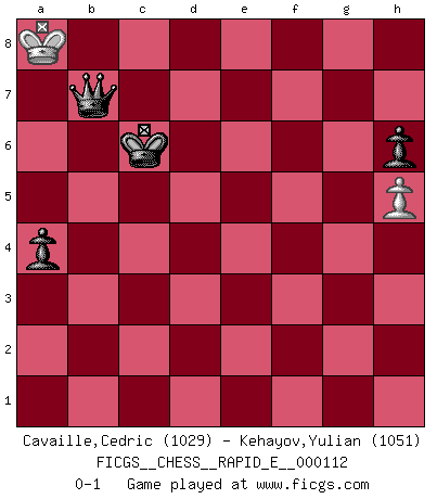 Last move : 0-1 2013 September 18 22:26:59 [Event "FICGS__CHESS__RAPID_E__000112"] [Site "FICGS"] [Date "2013.09.14"] [Round "1"] [White "Cavaille,Cedric"] [Black "Kehayov,Yulian"] [Result "0-1"] [WhiteElo "1029"] [BlackElo "1051"] 1.d4 d5 2.Nc3 e6 3.e4 dxe4 4.Nxe4 Nf6 5.Bg5 Be7 6.Nxf6+ Bxf6 7.Bxf6 Qxf6 8.Nf3 O-O 9.Bd3 a6 10.O-O Nc6 11.c3 h6 12.Qe2 Re8 13.Ne5 Nxe5 14.Qxe5 Qxe5 15.dxe5 b5 16.Be4 Rb8 17.b4 Bb7 18.Bxb7 Rxb7 19.Rfd1 c6 20.Rd6 Rc7 21.Rad1 c5 22.Rd8 Kf8 23.Rxe8+ Kxe8 24.f4 cxb4 25.cxb4 Rc2 26.a3 Ra2 27.Rd3 Ke7 28.h4 Ra1+ 29.Kh2 Rc1 30.Kh3 Rc4 31.Rf3 f6 32.exf6+ Kxf6 33.Kg4 e5 34.g3 g6 35.Kh3 Kf5 36.fxe5 Kxe5 37.g4 Rf4 38.Rxf4 Kxf4 39.h5 g5 40.Kg2 Kxg4 41.Kf2 Kf4 42.Ke2 g4 43.Kd3 g3 44.Kd4 g2 45.a4 bxa4 46.Kc5 g1Q+ 47.Kc6 Qd4 48.b5 axb5 49.Kxb5 Ke5 50.Kc6 Qd5+ 51.Kb6 Kd6 52.Ka6 Qb3 53.Ka7 Kc6 54.Ka8 Qb7+ 0-1 Queen's pawn : Chigorin variation Kingside Castling by player Black (move 8) Kingside Castling by player White (move 10) 10 pieces endgame at move 38 : White KPPPP , Black KPPPP WHITE : King + 4 Pawns BLACK : King + 4 Pawns 9 pieces endgame at move 40 : White KPPP , Black KPPPP WHITE : King + 3 Pawns BLACK : King + 4 Pawns 8 pieces endgame at move 45 : White KPP , Black KPPPP WHITE : King + 2 Pawns BLACK : King + 4 Pawns Promotion Queen by player Black (move 46) 7 pieces endgame at move 48 : White KP , Black KQPPP WHITE : King + 1 Pawn BLACK : King + 1 Queen 3 Pawns 6 pieces endgame at move 49 : White KP , Black KQPP WHITE : King + 1 Pawn BLACK : King + 1 Queen 2 Pawns Player Black won this chess game. Follow this game move after move (download)When you see a good move, look for a better one. (Emanuel Lasker) Du musst Deinen Gegner in einen tiefen dunklen Wald führen wo 2+2=5 ist und wo der Weg, der wieder hinausführt, nur breit genug für einen ist. (Mikhail Nekhemyevich Tal) Yo jugué Ajedrez con el y a veces le pude haber ganado solo que siempre devuelve su última jugada y juega la partida de manera diferente. (Mark Twain) Les réformistes prétendent que les progrès de la théorie conduiront à la disparition des échecs, et qu'il faut, pour leur rendre vie, en remanier les règles. En réalité, qu'exprime cette affirmation? Le mépris de l'intuition, de l'imagination et de tous les autres éléments qui font des échecs un art. (Alexander Alekhine) Heh, heh, heh. Time to abandon ship. (General Grievous in Star Wars ep.3)
