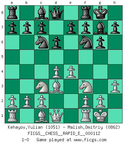 Last move : 1-0 2013 October 25 5:43:0 [Event "FICGS__CHESS__RAPID_E__000112"] [Site "FICGS"] [Date "2013.09.14"] [Round "1"] [White "Kehayov,Yulian"] [Black "Malish,Dmitriy"] [Result "1-0"] [WhiteElo "1051"] [BlackElo "0862"] 1.e4 d6 2.d4 Nf6 3.Bd3 g6 4.Nf3 Bg7 5.O-O O-O 6.h3 Nc6 7.Nc3 1-0 This chess game has been lost on time (started : 2013.09.14 10:2:50) King's pawn Opening Kingside Castling by player White (move 5) Kingside Castling by player Black (move 5) Player White won this chess game. Follow this game move after move (download)Chess is a sea in which a gnat may drink and an elephant may bathe. (Hindu proverb) Das Spiel gibt uns die Genugtuung, die das Leben uns versagt. (Emanuel Lasker) A través de las casillas del tablero, los Indios explican el movimiento del tiempo y la edad, las influencias mas altas que controlan el mundo y los lazos que vinculan al Ajedrez con el alma humana. (Al-Masudi) La solitude du joueur d'Echecs à l'approche du mat est semblable à celle du condamné. (Francis Szpiner) The right perception of any matter and a misunderstanding of the same matter do not wholly exclude each other. (Kafka's the trial)