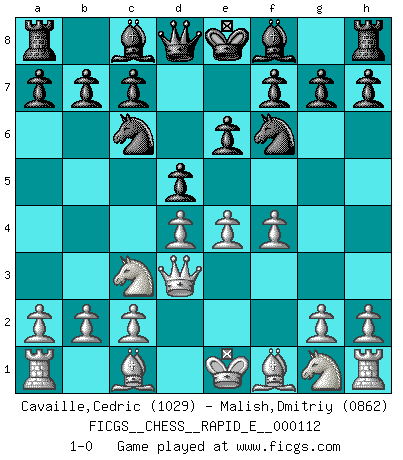 Last move : 1-0 2013 October 19 4:37:48 [Event "FICGS__CHESS__RAPID_E__000112"] [Site "FICGS"] [Date "2013.09.14"] [Round "1"] [White "Cavaille,Cedric"] [Black "Malish,Dmitriy"] [Result "1-0"] [WhiteElo "1029"] [BlackElo "0862"] 1.d4 d5 2.Nc3 Nf6 3.f4 e6 4.Qd3 Nc6 5.e4 1-0 This chess game has been lost on time (started : 2013.09.14 10:2:50) Queen's pawn : Chigorin variation Player White won this chess game. Follow this game move after move (download)Without error there can be no brilliancy. (Emanuel Lasker) Wenn es im Universum noch irgendwo intelligente Lebewesen gibt, dann kennen sie Go. (Emanuel Lasker) Las leyes del Ajedrez no permiten una libre elección: tienes que mover quieras o no. (Emanuel Lasker) Il n'y a plus de joueurs du niveau de Jacob Murray dont la seule quête est le beau jeu, le plaisir de voir les pièces construire quelque chose. Sur 10 idées à la minute, 9 seront sans intérêt, la dernière s'avèrera géniale. (Christian Bauer) The ego is not master in its own house. (Sigmund Freud)