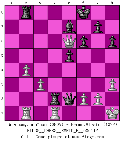 Last move : 0-1 2013 October 6 19:35:57 [Event "FICGS__CHESS__RAPID_E__000112"] [Site "FICGS"] [Date "2013.09.14"] [Round "1"] [White "Gresham,Jonathan"] [Black "Bromo,Alexis"] [Result "0-1"] [WhiteElo "0809"] [BlackElo "1092"] 1.e4 e5 2.Nf3 Nc6 3.Bb5 d6 4.O-O h6 5.Re1 Bd7 6.Nc3 a6 7.Bc4 b5 8.Bb3 Nf6 9.d3 Na5 10.Be3 c5 11.a3 c4 12.Ba2 Be6 13.dxc4 bxc4 14.Qe2 Be7 15.Nd2 O-O 16.Nxc4 Nxc4 17.Bxc4 Bxc4 18.Qxc4 Qd7 19.Rab1 Rfc8 20.Qe2 d5 21.exd5 Nxd5 22.Nxd5 Qxd5 23.Red1 Qc6 24.c3 f6 25.Qg4 Kf8 26.Bd2 Rd8 27.Qh3 Rab8 28.b4 a5 29.Kh1 axb4 30.axb4 Qb5 31.Qe6 Qe2 32.h3 Rxd2 0-1 Ruy Lopez : Old Steinitz defense Kingside Castling by player White (move 4) Kingside Castling by player Black (move 15) Player Black won this chess game. Follow this game move after move (download)When you don't know what to do, wait for your opponent to get an idea - it's sure to be wrong. (Tarrasch) Ich glaube, ich kenne inzwischen die Gründe für mein Versagen: schachliche Charakterfehler. Ich war nie ein Wunderkind und in meiner gesamten menschlichen Entwicklung immer zu langsam. (Viktor Kortschnoi) Yo no le temo a Spassky. Todos saben que yo soy el mejor. Uno no necesita un torneo para probarlo. (Bobby Fischer) La victoire dans une partie d'Echecs appartient la plupart du temps à celui qui voit un peu plus loin que l'adversaire. (Lasker) Everything in life is luck. (Donald Trump)